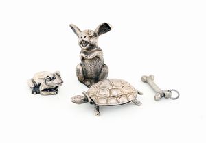 peso complessivo gr. 156 rana, coniglio, tartaruga portapillole e pendente a forma di osso