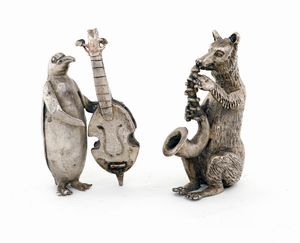 altezza cm 8 - peso complessivo gr. 424 raffiguranti un pinguino con contrabasso ed un orso con sassofono