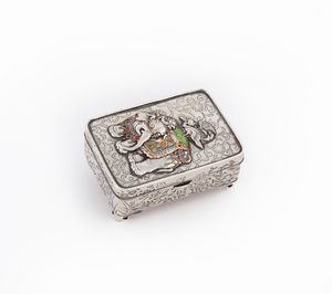 cm 3,3x8,2x5,7 - gr. 132 decorata sul coperchio da una figura di elefante bardato sormontato da un uccello fantastico [..]