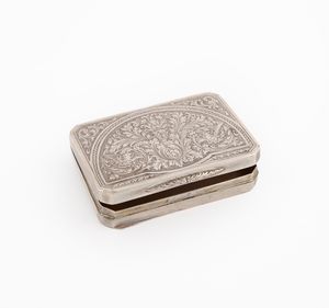 cm 3,5x3,2 - gr. 10 con fitta decorazione incisa a volute e motivi vegetali; sul coperchio riserva liscia per [..]