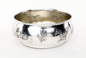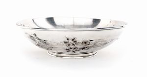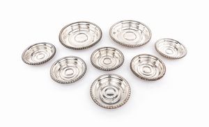 peso complessivo gr. 1000 ca. una scatola circolare con coperchio, una coppetta liscia, un vassoietto ovale, due [..]