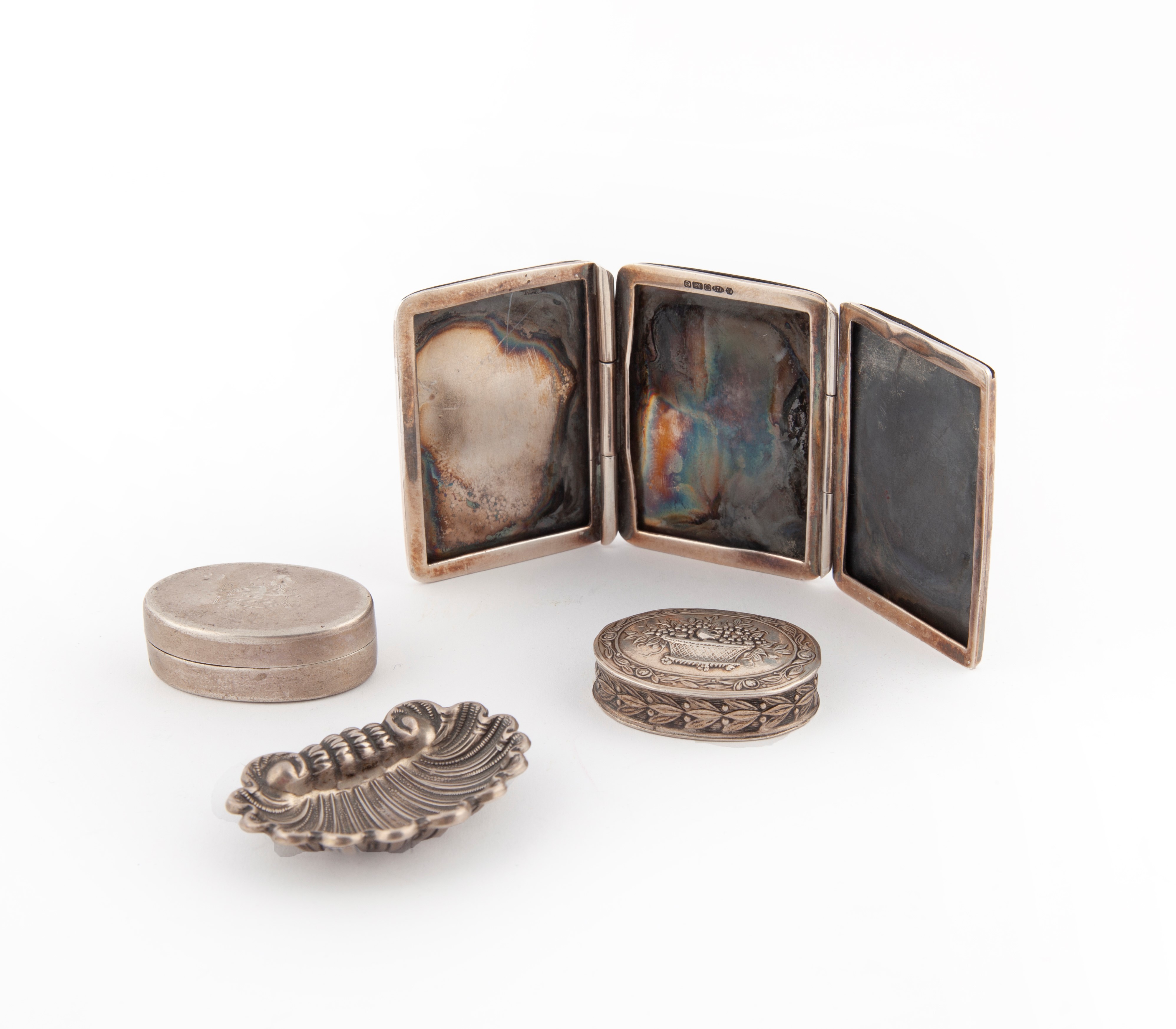 trittico portafoto, posacenere a conchiglia e due portapillole ovali, rispettivamente dell'argentiere Mancini & Lefevre con iniziali M.D. e l'altro con cesta di fiori e frutta sbalzata