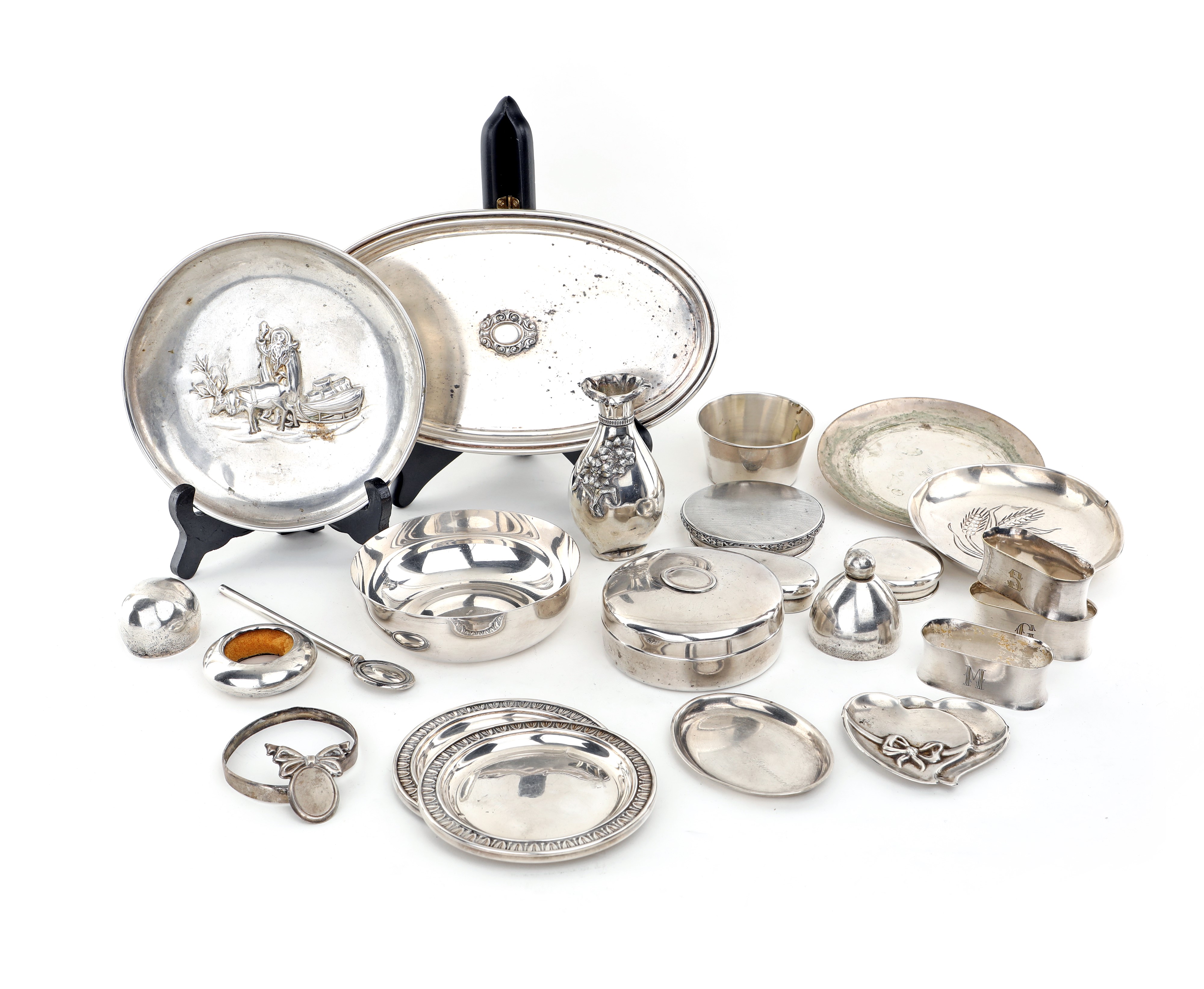peso complessivo gr. 1000 ca. una scatola circolare con coperchio, una coppetta liscia, un vassoietto ovale, due piatti con decoro sbalzato e cinque piattini di diversa misura, un vasetto, un anello salvagoccia da bottiglia, tre anelli ovali portatovagliolo con iniziali, cinque coperchi diversi e due frammenti
