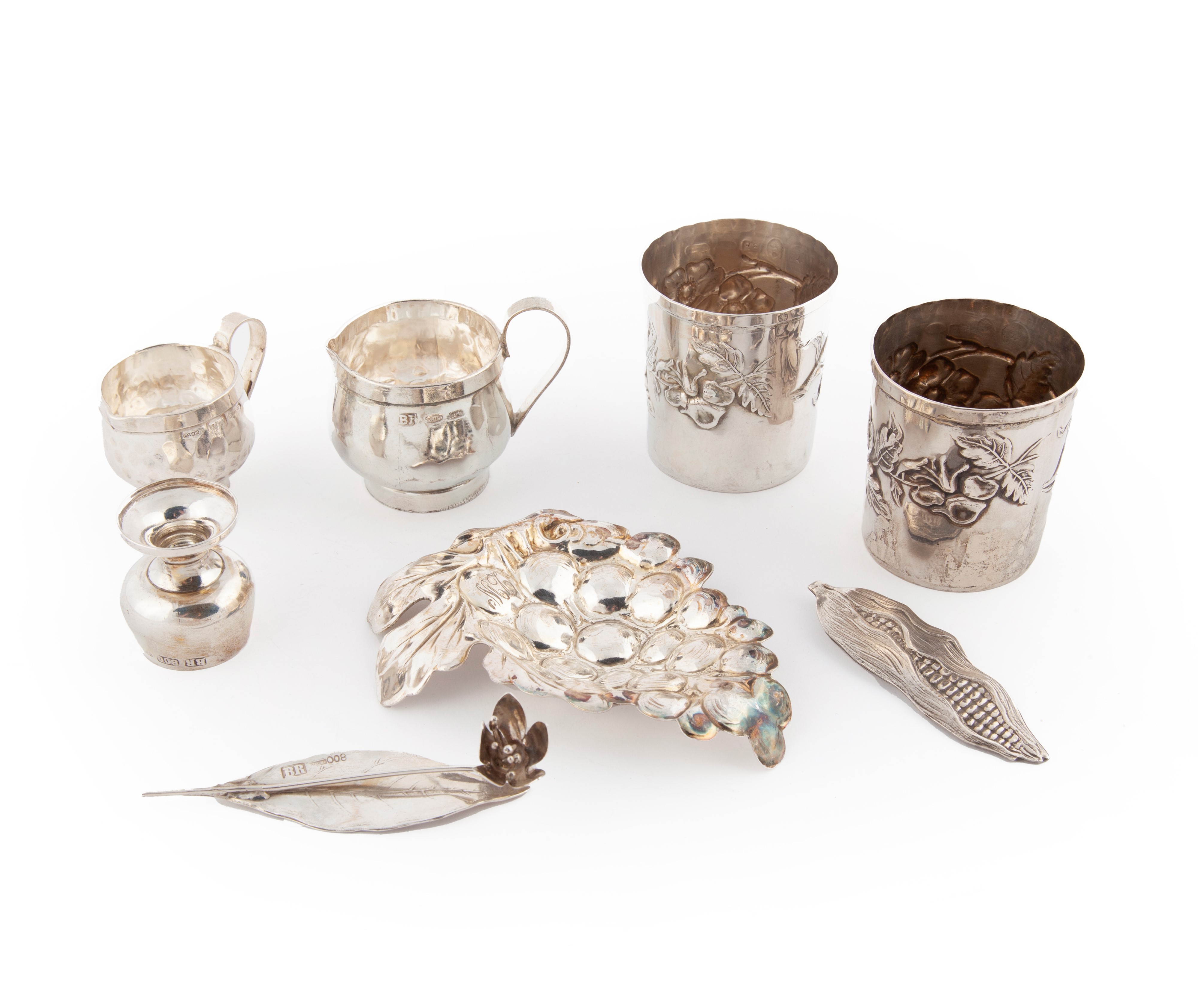 due piccoli bicchieri cilindrici con tralcio fiorito sbalzato, due piccole lattiere di diversa misura con superficie martellata e manico a nastro, un calice, un piattino in forma di grappolo d'uva, un segnapagina a forma di pannocchia ed un segnaposto a forma di fiore reciso