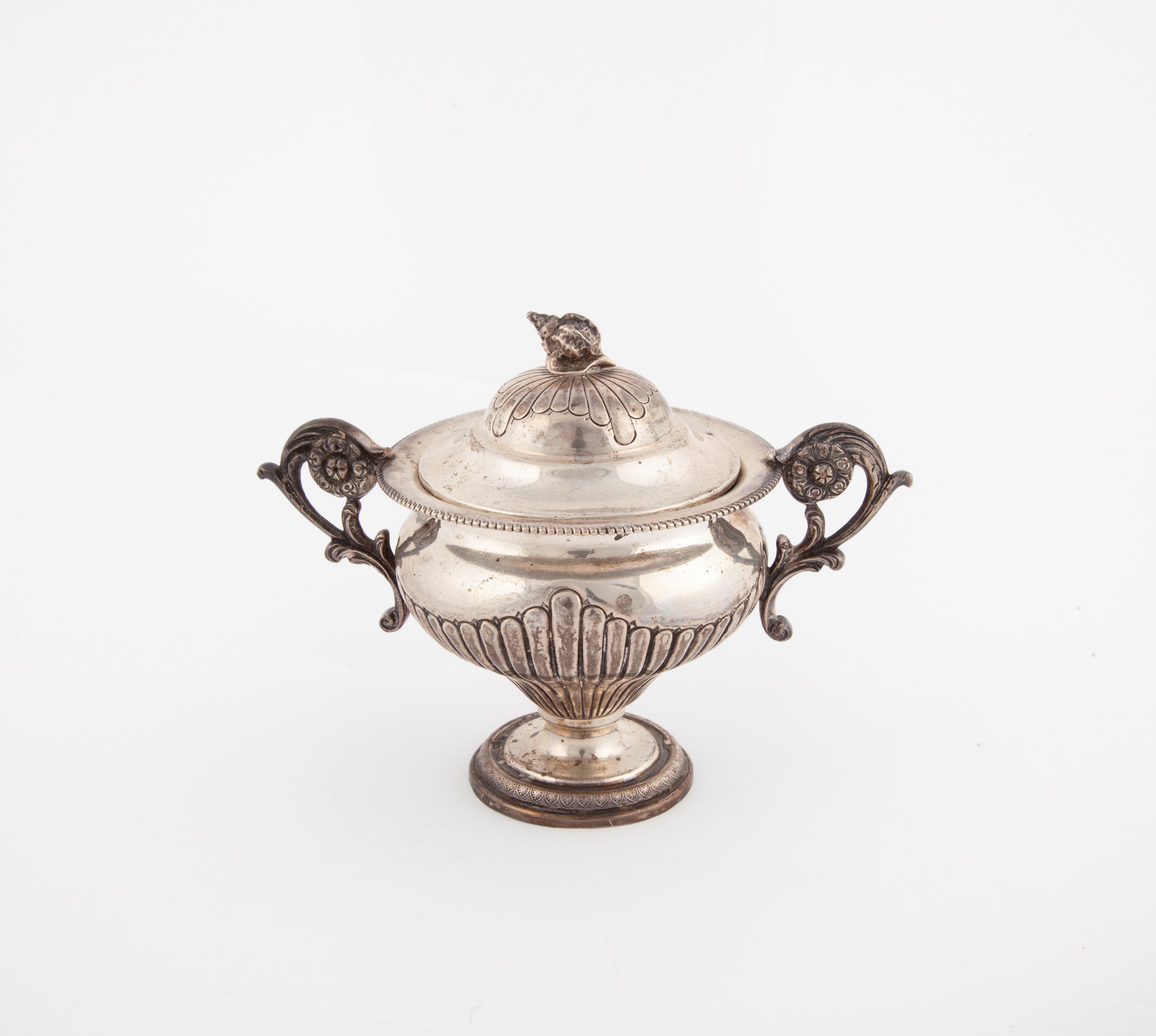 a forma di coppa biansata con coperchio sormontato da una conchiglia; manici sagomati decorati da corolle cesellate