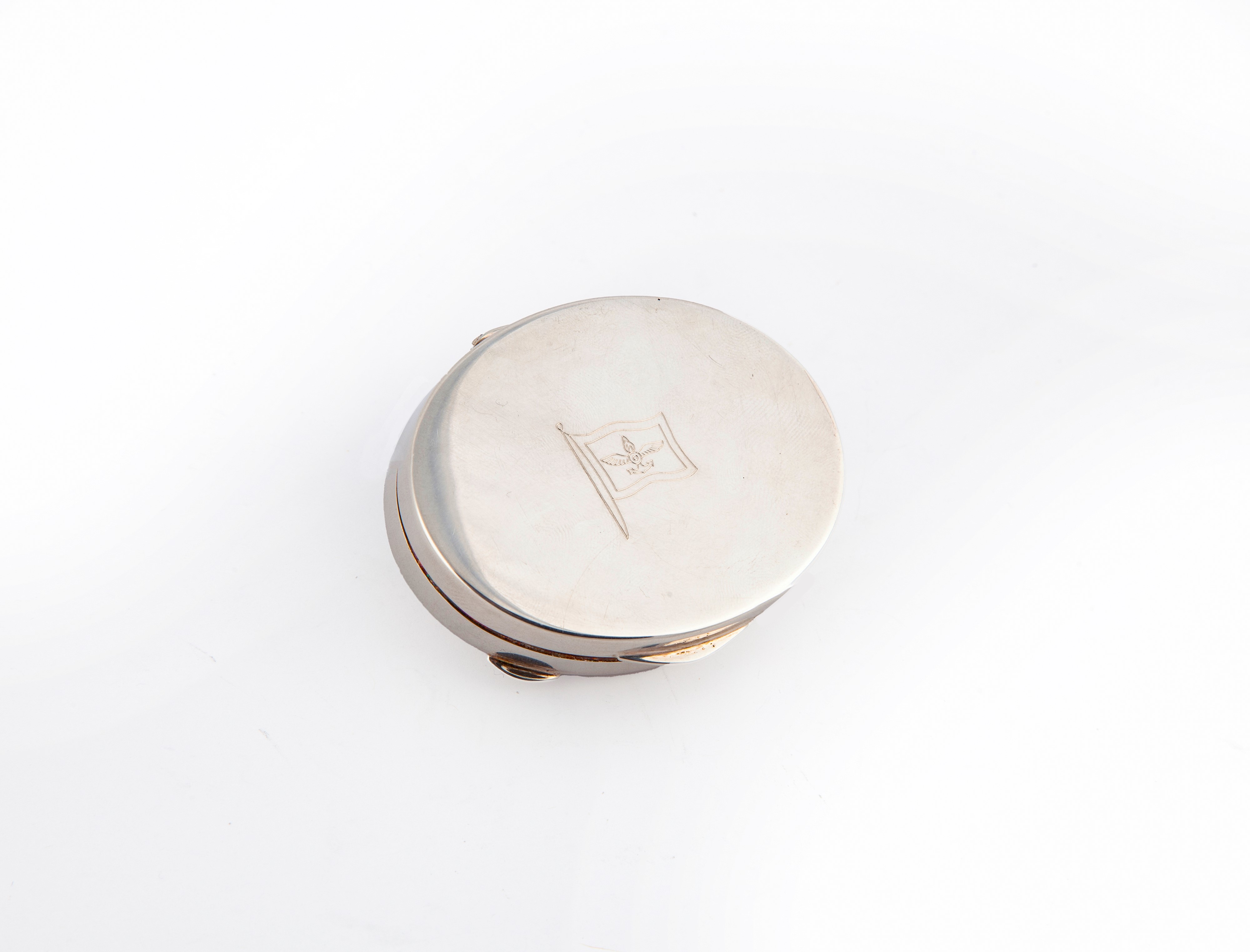 a superficie liscia e coperchio incernierato decorato da vessillo con àncora alata inciso; al verso la firma di Giovanni Spadolini