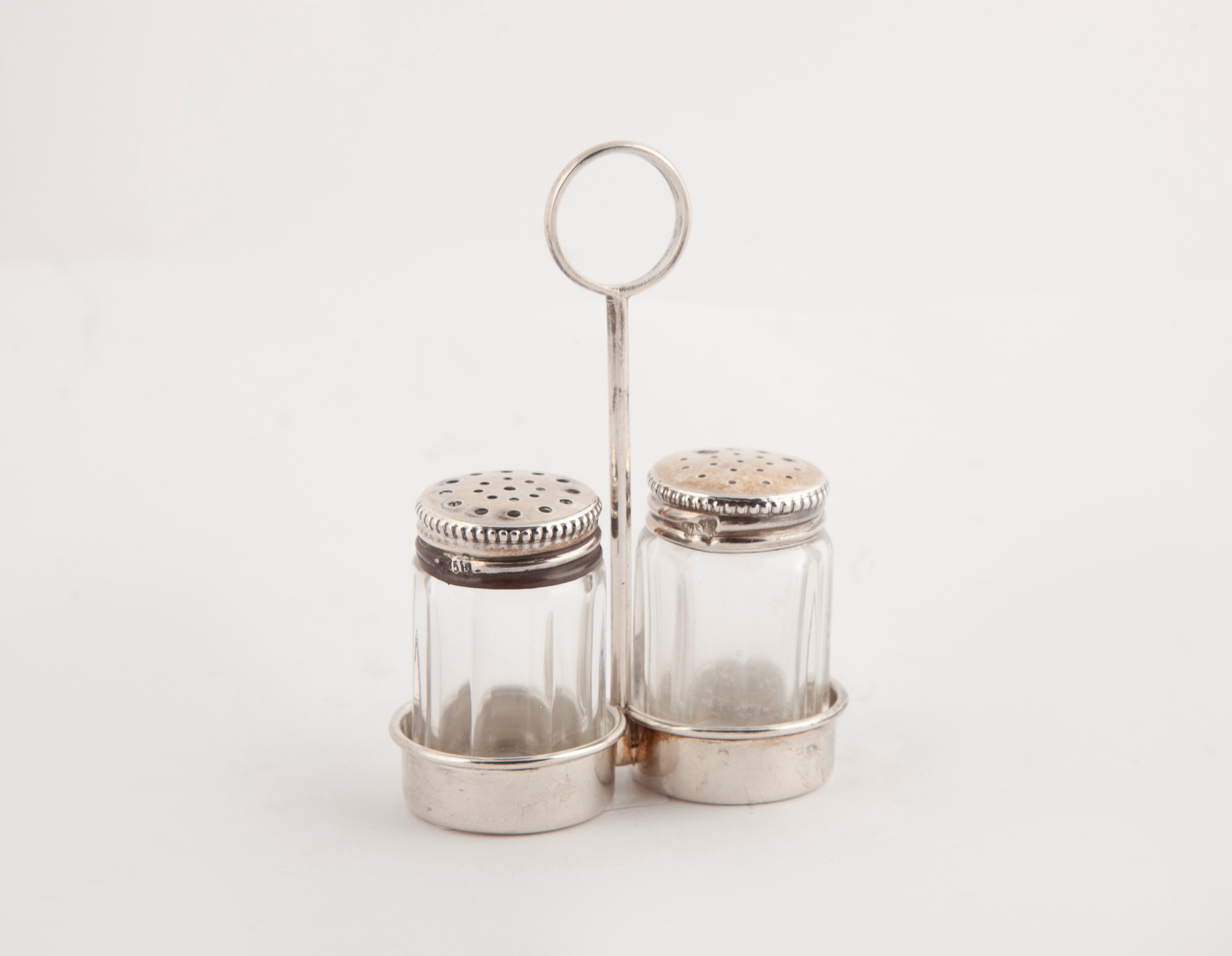 con piccoli flaconi in vetro con tappi in argento entro esile struttura con presa astile centrale
