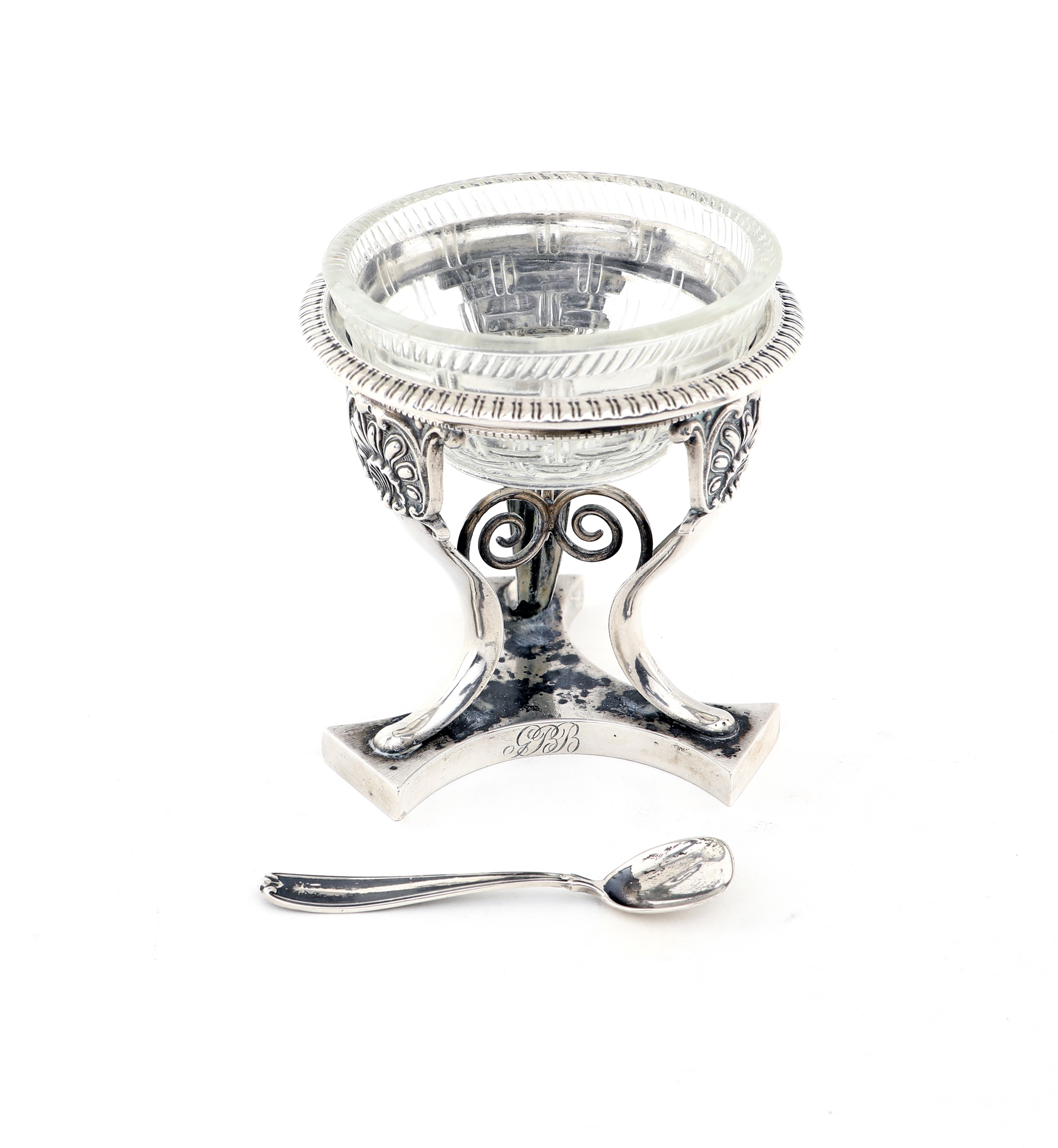 con vaschetta circolare in vetro racchiusa da telaio sostenuto da tre elementi sagomati decorati all'attaccatura da valve sbalzate e cesellate, riuniti da traverse a ricciolo e poggianti su base trilobata. Cucchiaino non pertinente