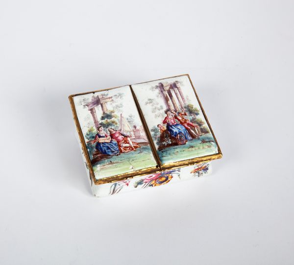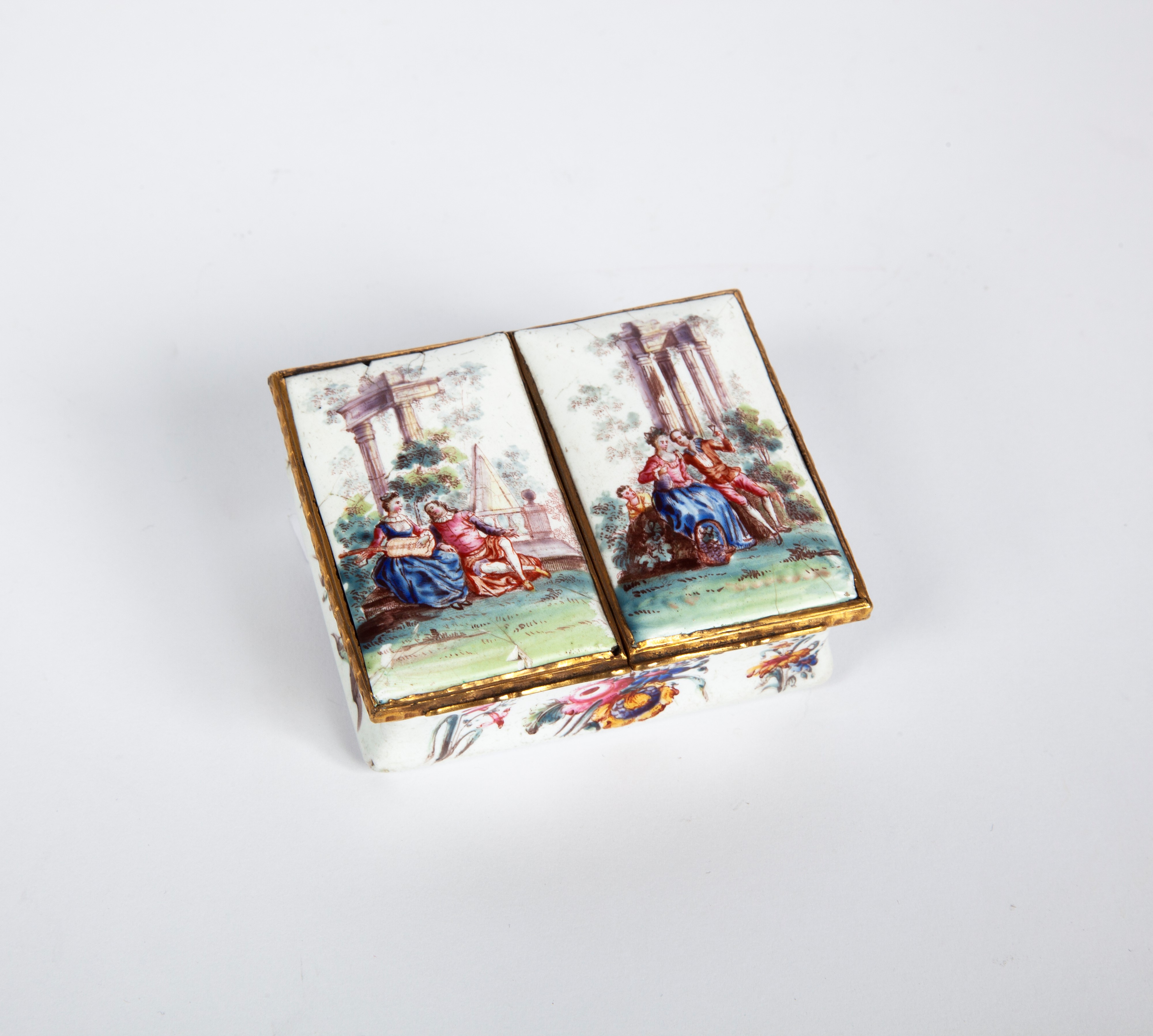 cm 3x8x6,5 di orma rettangolare con coperchio bipartito decorato in vivace policromia da due scene galanti ambientate in un paesaggio con rovine architettoniche; lungo la fascia motivi floreali. Difetti