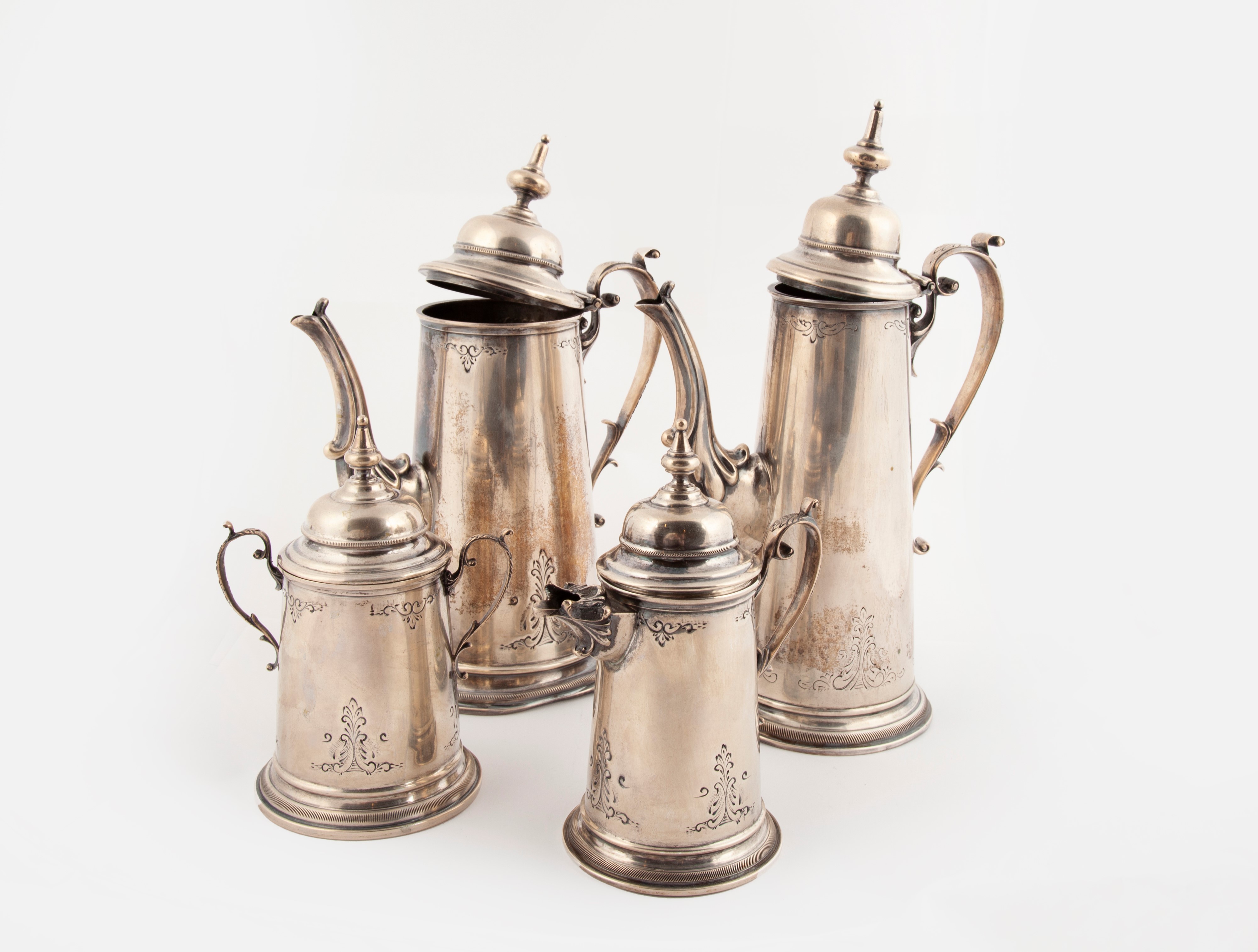 due caffettiere di diversa altezza, una lattiera ed una zuccheriera con coperchio; ogni elemento ha corpo cilindrico e decorazione minima a motivi vegetali incisi. Difetti