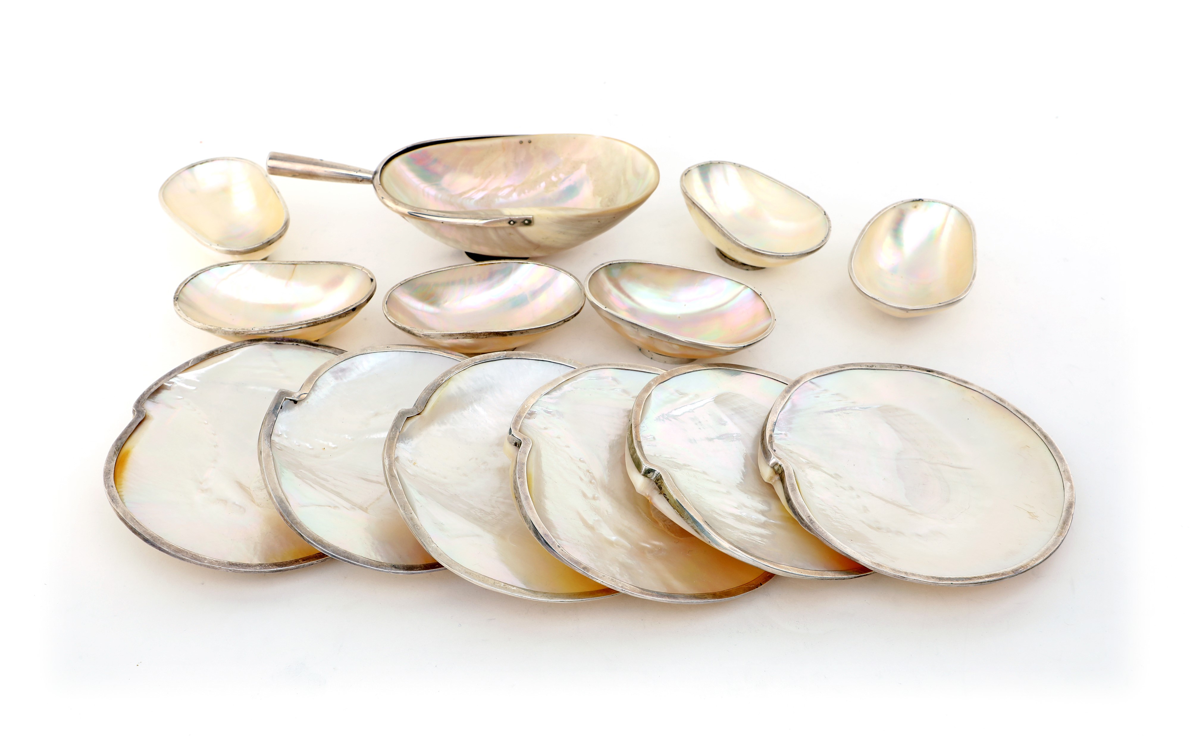 cm 3x10x6,5 ca. - cm 15x14 e cm 6,5x22,5x9,5 rispettivamente composto da sei coppette costituite da conchiglie di abalone, sei piatti a valva sorretti da piedini a sfera in argento ed una coppetta più grande con manico; quest'ultima punzonata Gucci Boutique. Un piedino mancante