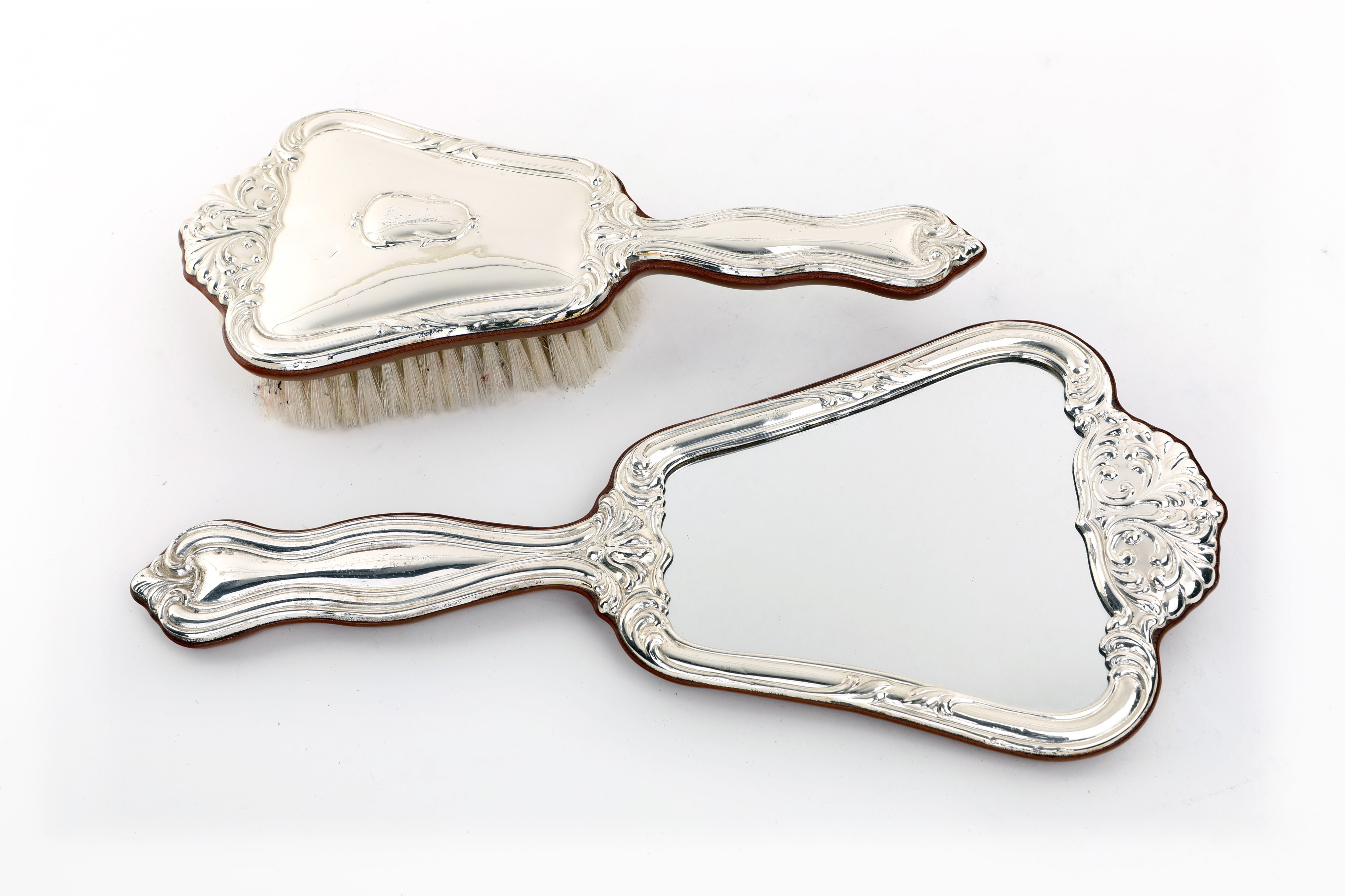 Specchio e spazzola in legno rivestisti con lamina d'argento