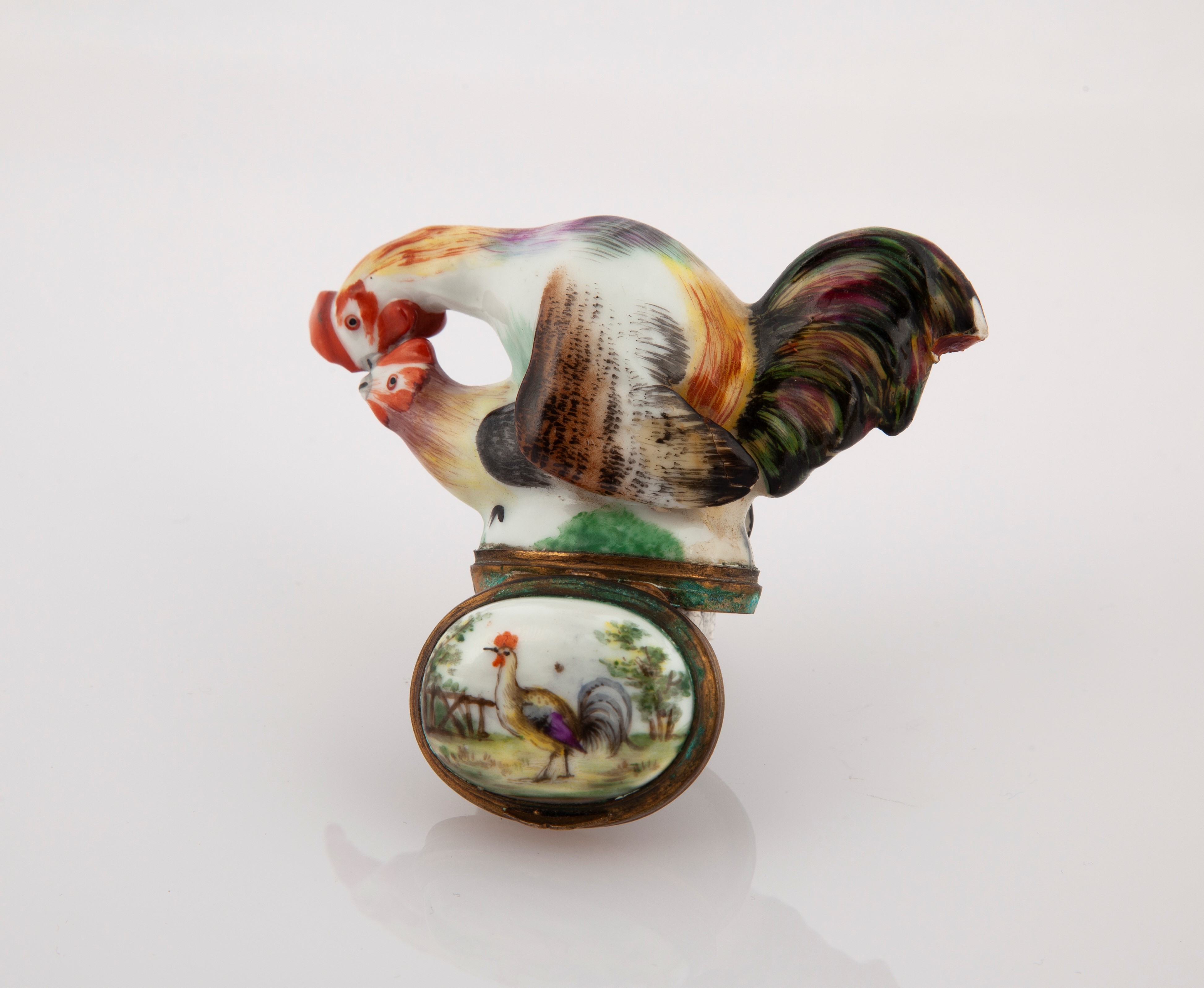 Tabacchiera in porcellana policroma e bronzo dorato, XVIII secolo