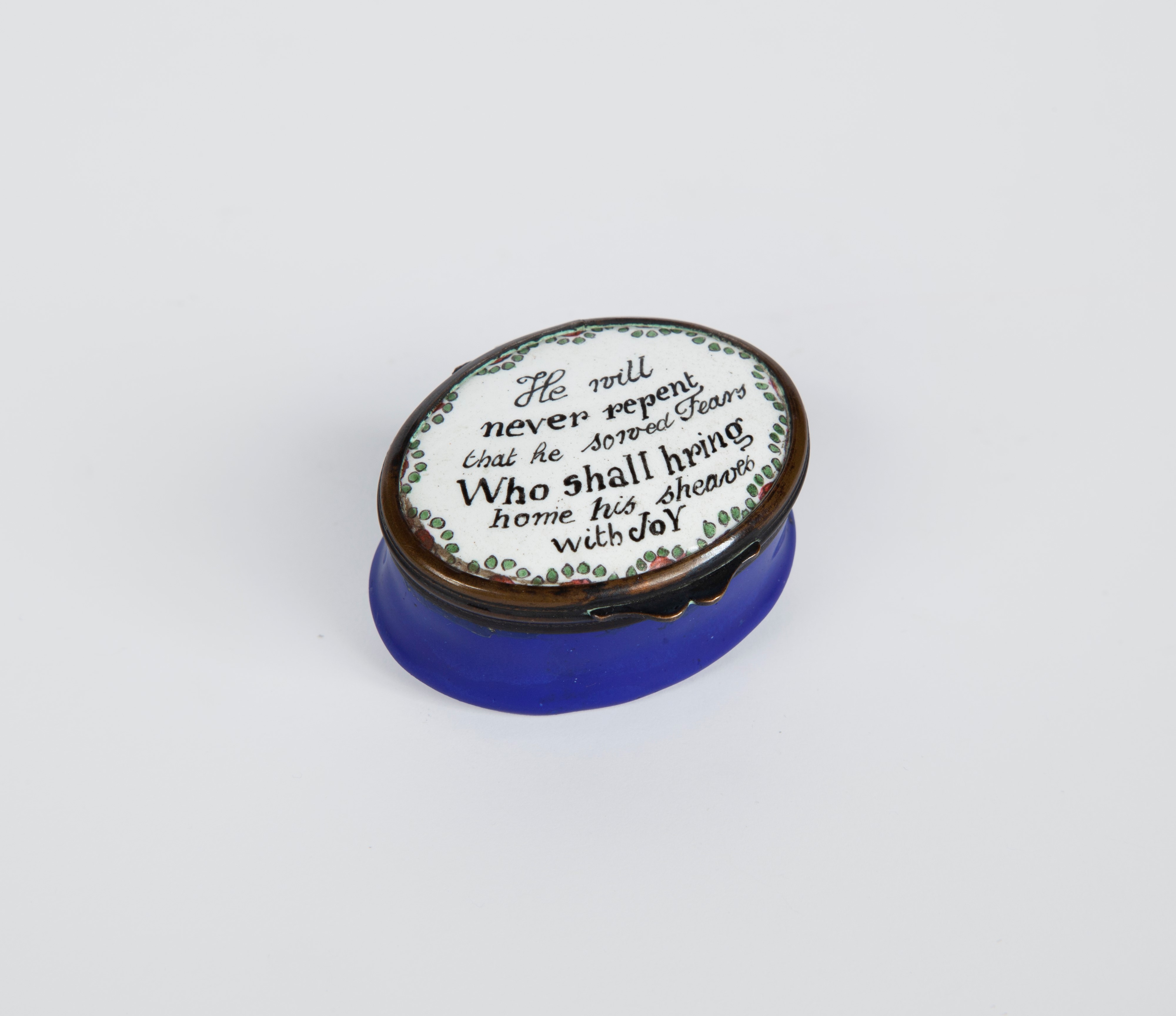 di forma ovale fondo blu con motto iscritto sul coperchio (He wil never repent that he served tears who shall bring home his sheaves with joy)