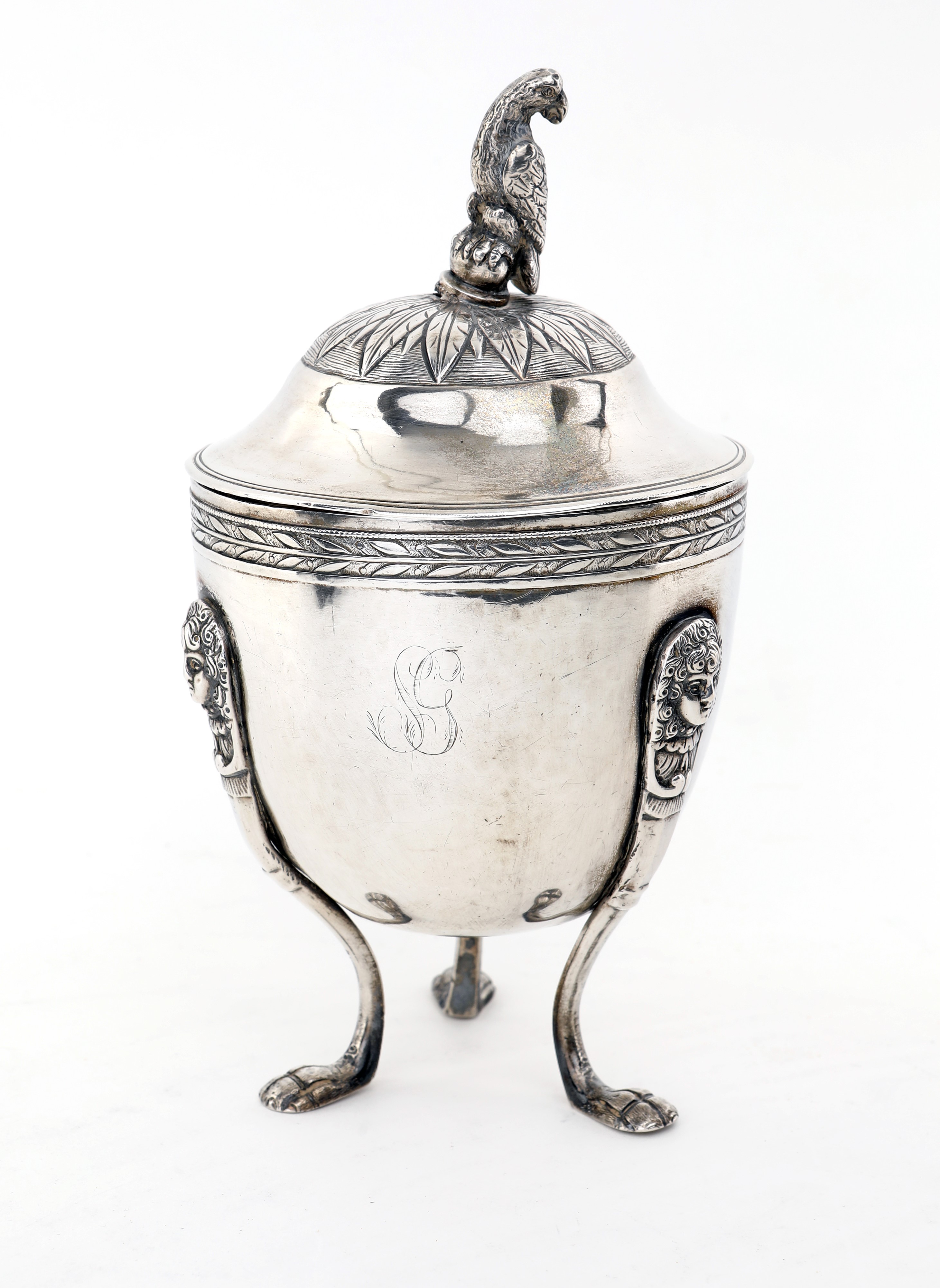 con corpo a uovo sorretto da tre gambe incurvate con piedi ferini e attacchi in forma di cariatide; coperchio a cupolino dominato da un pappagallo. Difetti