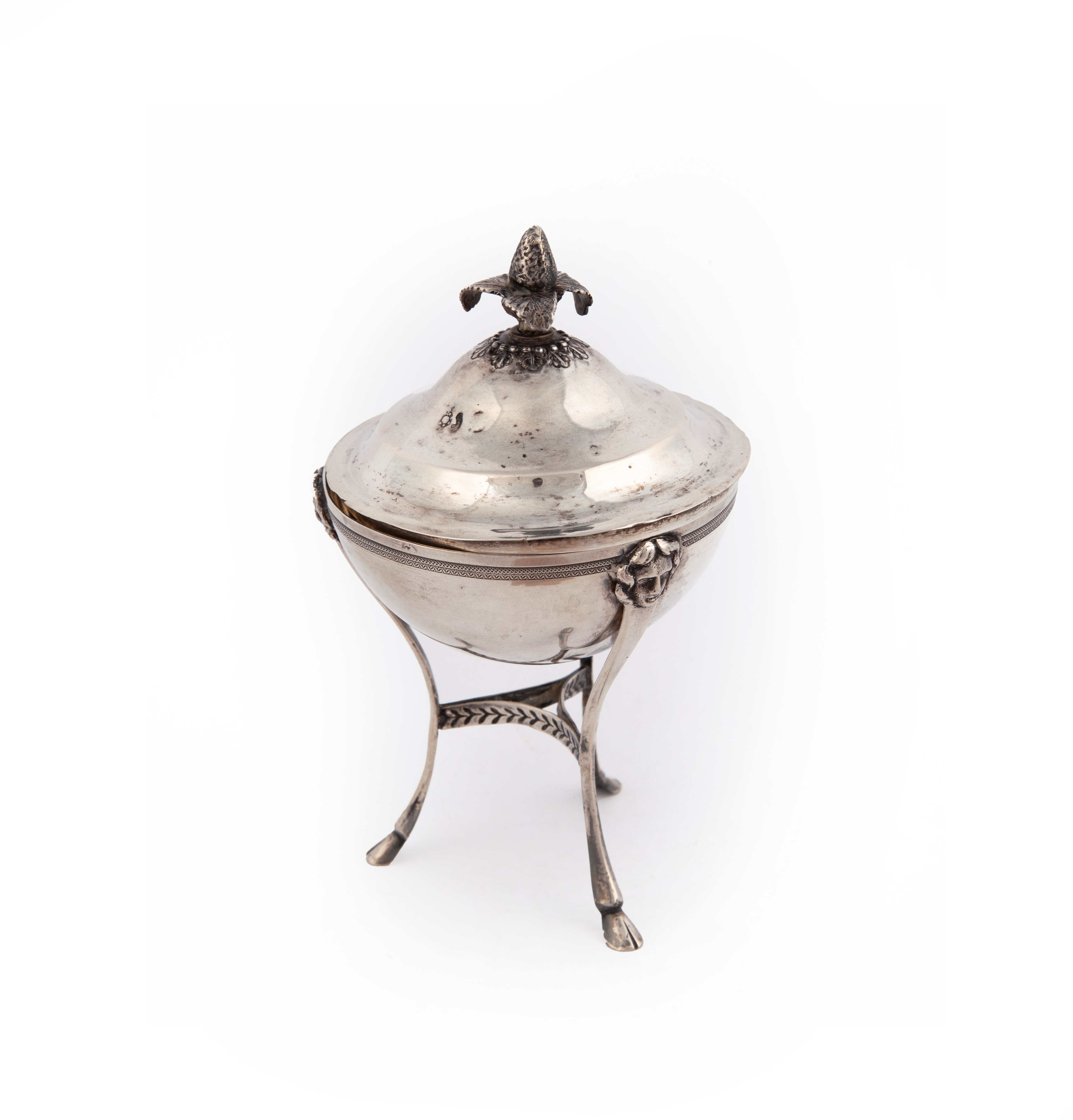 di forma semisferica sorretta da tre lunghe gambe a sciabola con mascherone all'attaccatura e terminali a zoccolo, riunite da traverse con decorazione stilizzata incisa; coperchio a cupolino sormontato da un frutto