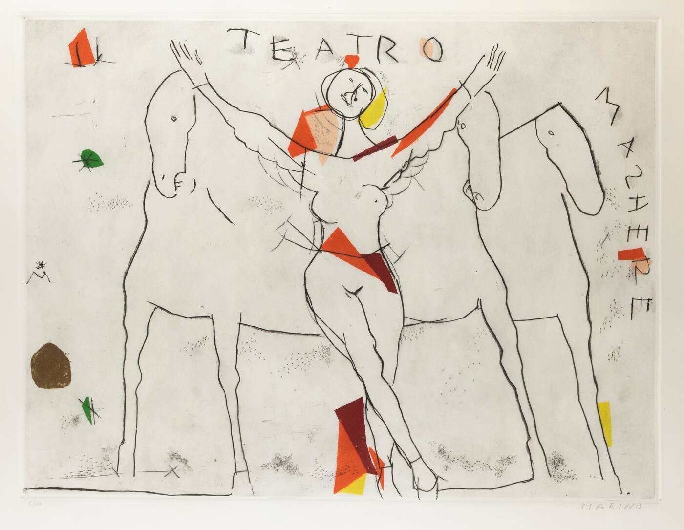 70x100 foglio 49x65 acquaforte e acquatinta a colori es. 5/50 Opera firmata in basso a destra e numerata in basso a sinistra (a matita sul foglio) Bibl.: - L. Carluccio e E. Steingraber Marino Marino opera grafica completa 1914 - 1975 cat. mostra maggio - giugno 1976 Torino Parco del Valentino Marino Marini - Opera grafica completa pag. 70 tav. A 162.