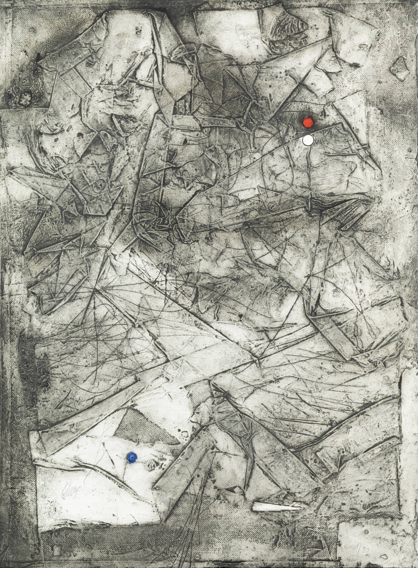75 5x56 cm incisione a rilievo e con tre inserti colorati es. 1/80 Opera firmata in basso a sinistra e numerata in basso a destra (a matita) Incisione originale edita dalla Galleria Marbeau Parigi