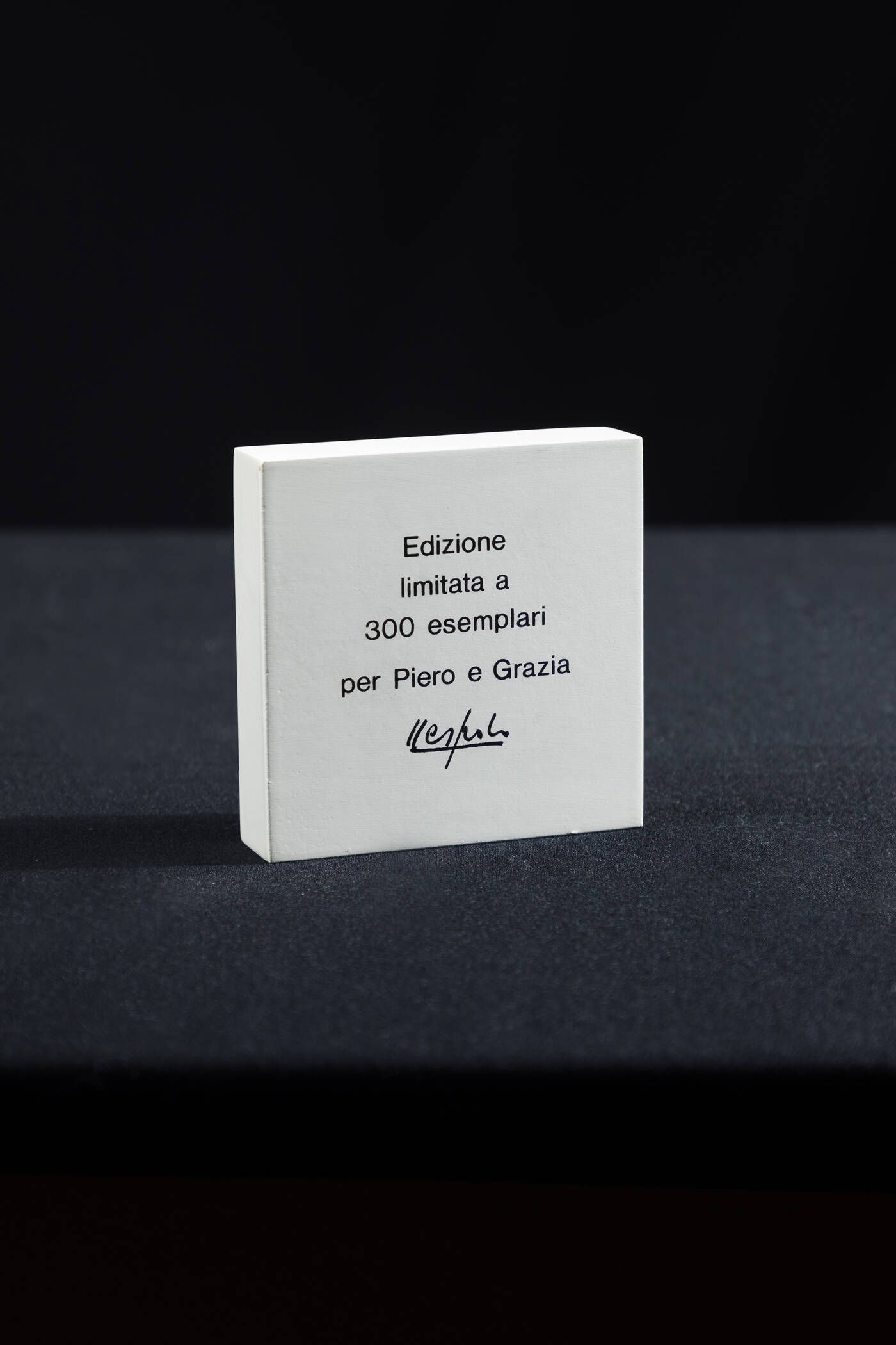 10x10x2 5 parallelepipedo in legno multiplo Opera firmata in basso a destra (a stampa); al retro reca la scritta: Edizione / limitata a / 300 esemplari / per Piero e Grazia e firma a stampa