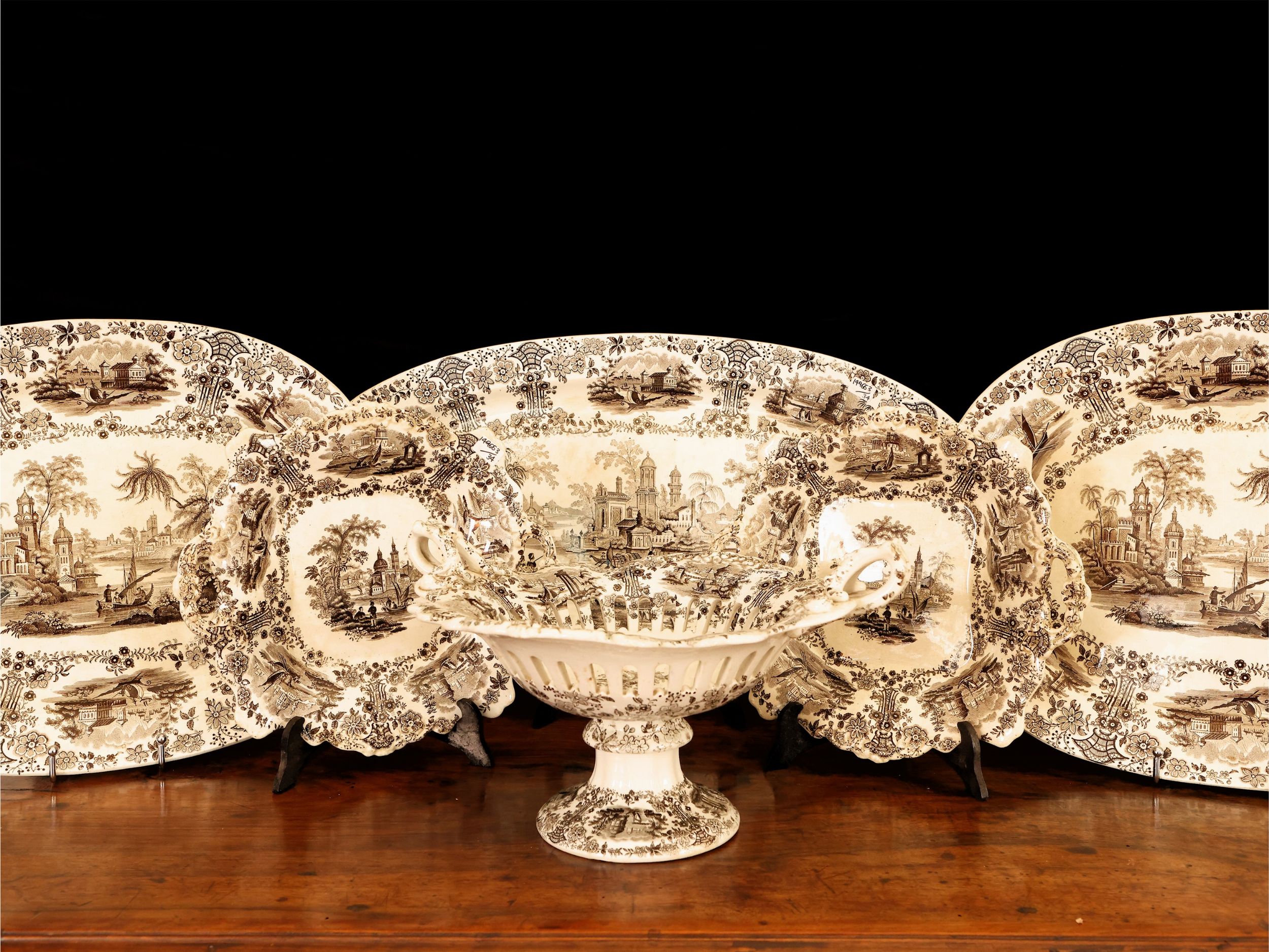 Inghilterra, fine del XIX secolo decorati in monocromia marrone con architetture esotiche e personaggi, composto da 22 piatti piani, 5 piatti fondi, due vassoi ovali, due vassoietti di forma quadrata, un vassoio da pesce, insalatiera ed alzata, alcuni difetti e rotture