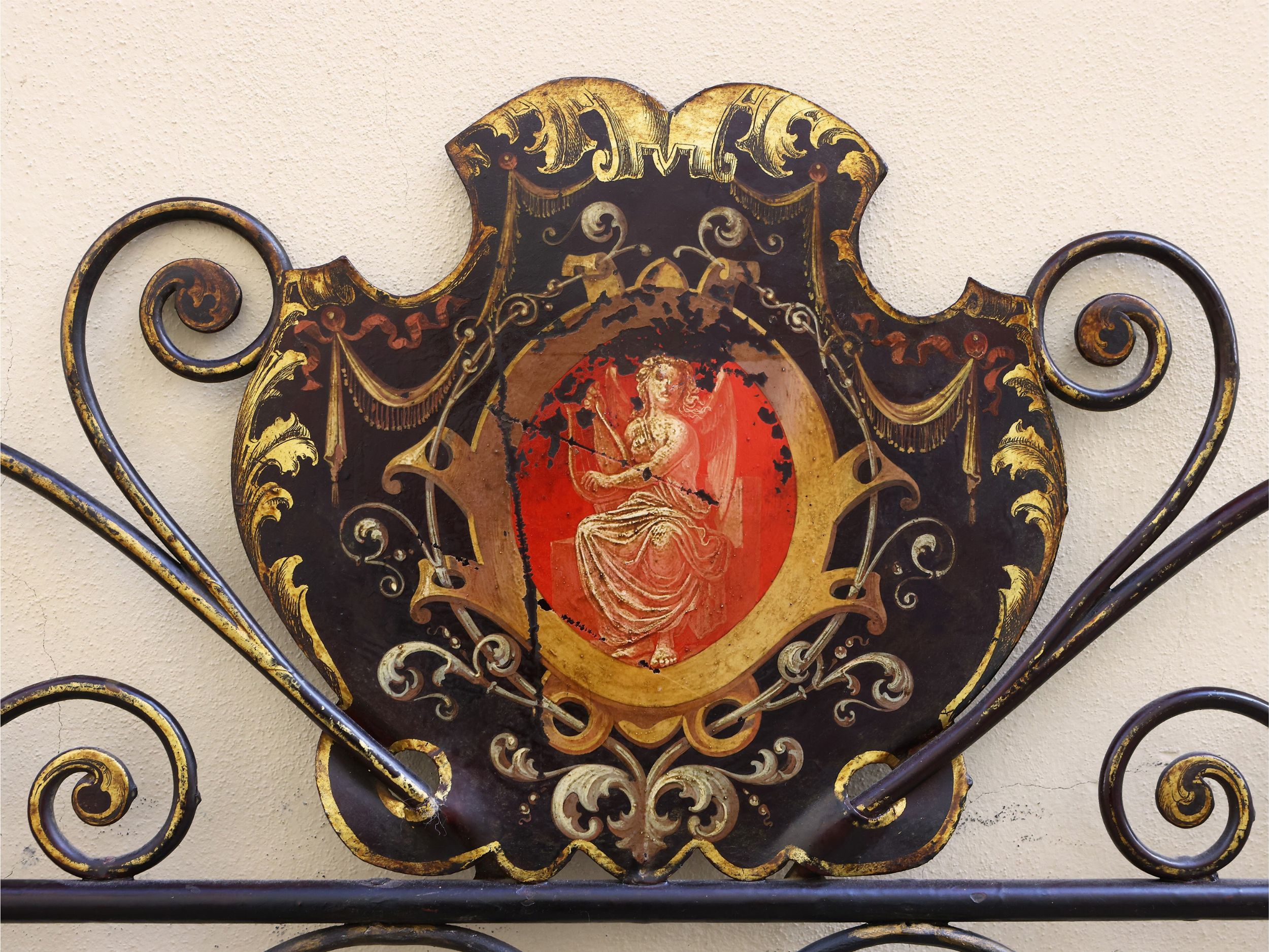 h cm 159x203x115 Liguria, metà del XIX secolo testiera a volute, centrata da scudo dipinto con angelo musicante, pediera a grottesche centrata da cartiglio dipinto con Amore con arco e frecce, finali a pinnacolo in bronzo dorato, completo di traverse, alcuni difetti e mancanze alla decorazione