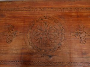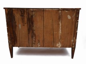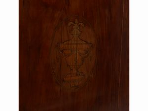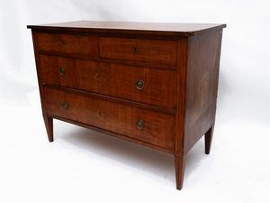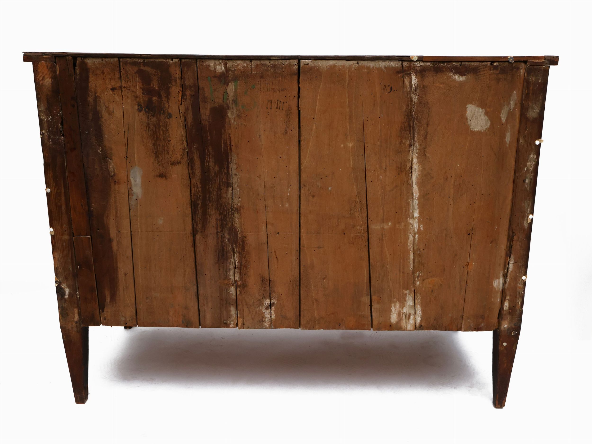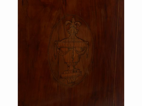 fiine del XVIII secolo intarsiato e pirografato con motivi vegetali e medaglioni, due mezzi cassetti ed altri due sottostanti sul fronte dritto, gambe a faretra, alcuni difetti