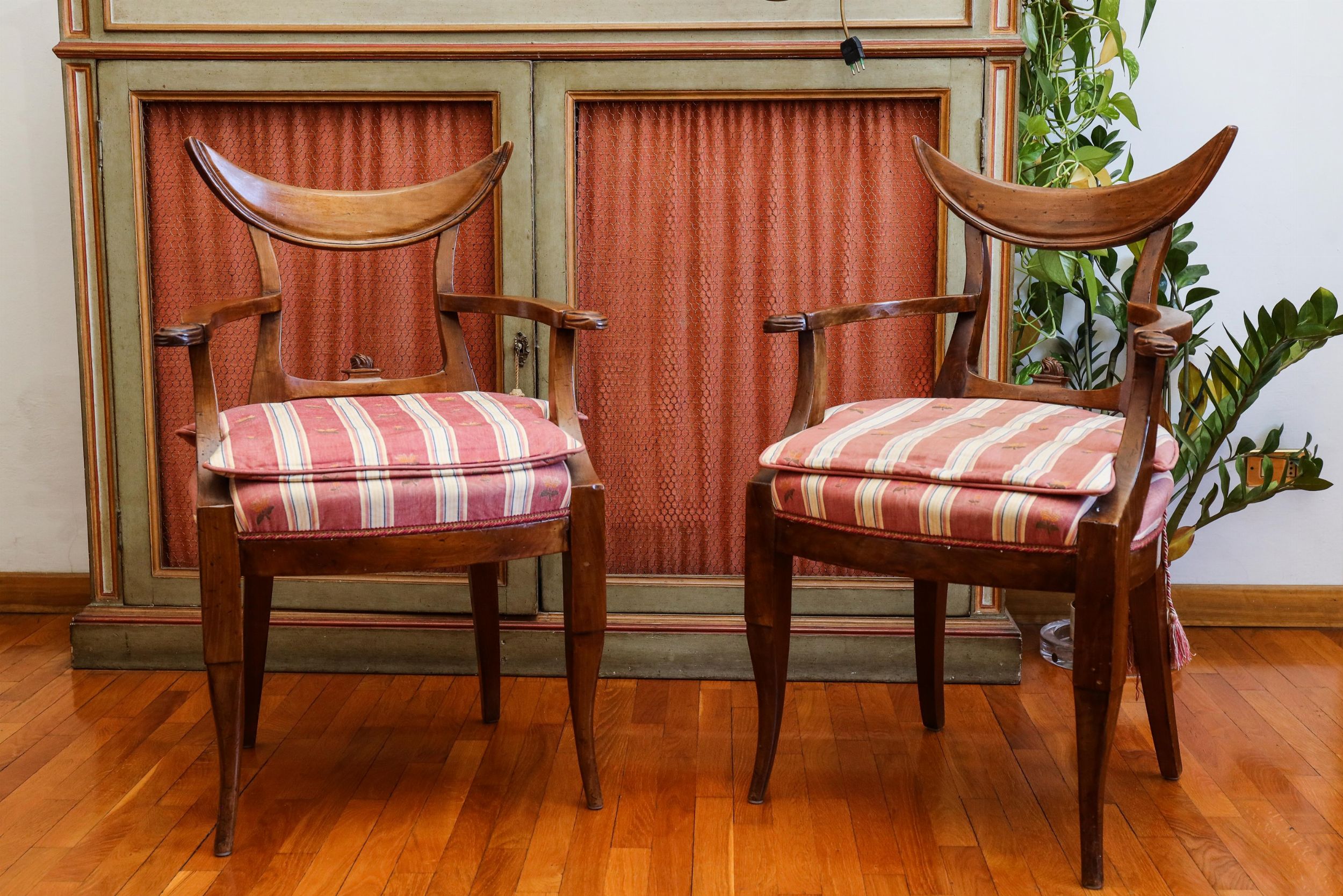 fine del XVIII/inizio del XIX secolo schienali con cartella a mezzaluna, braccioli a giorno con finale a fiamma, gambe leggermente a sciabola, sedili rivestiti in seta rigata nei toni del magenta, corredate di cuscini
