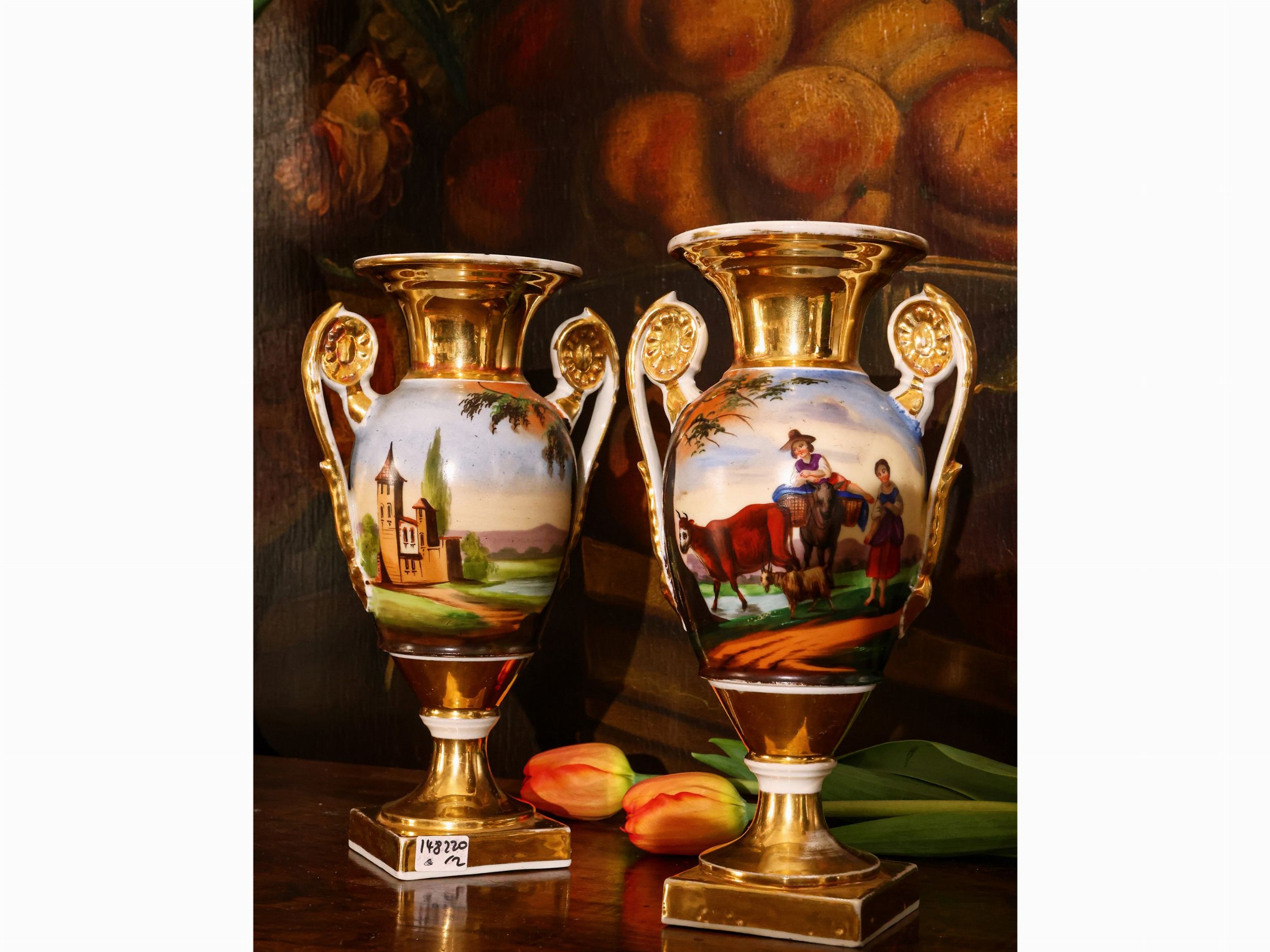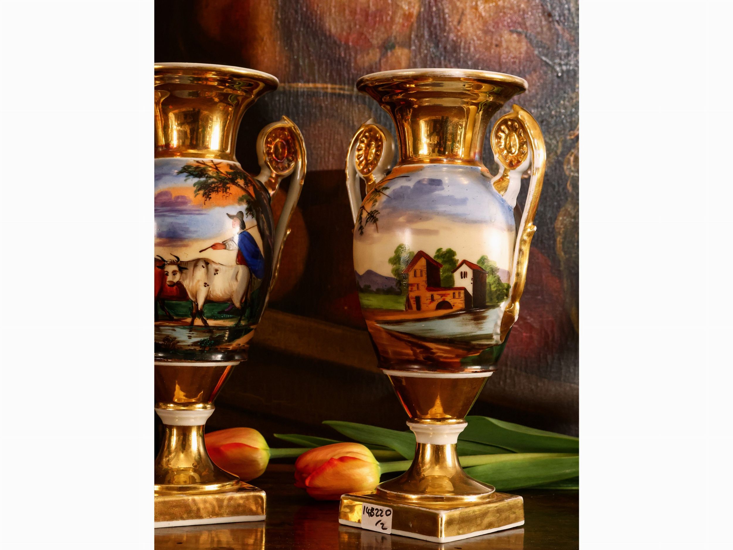 metà del XIX secolo dipinti a tutto tondo con paesaggi agresti e personaggi popolari, lumeggiati in oro, su basi a plinto