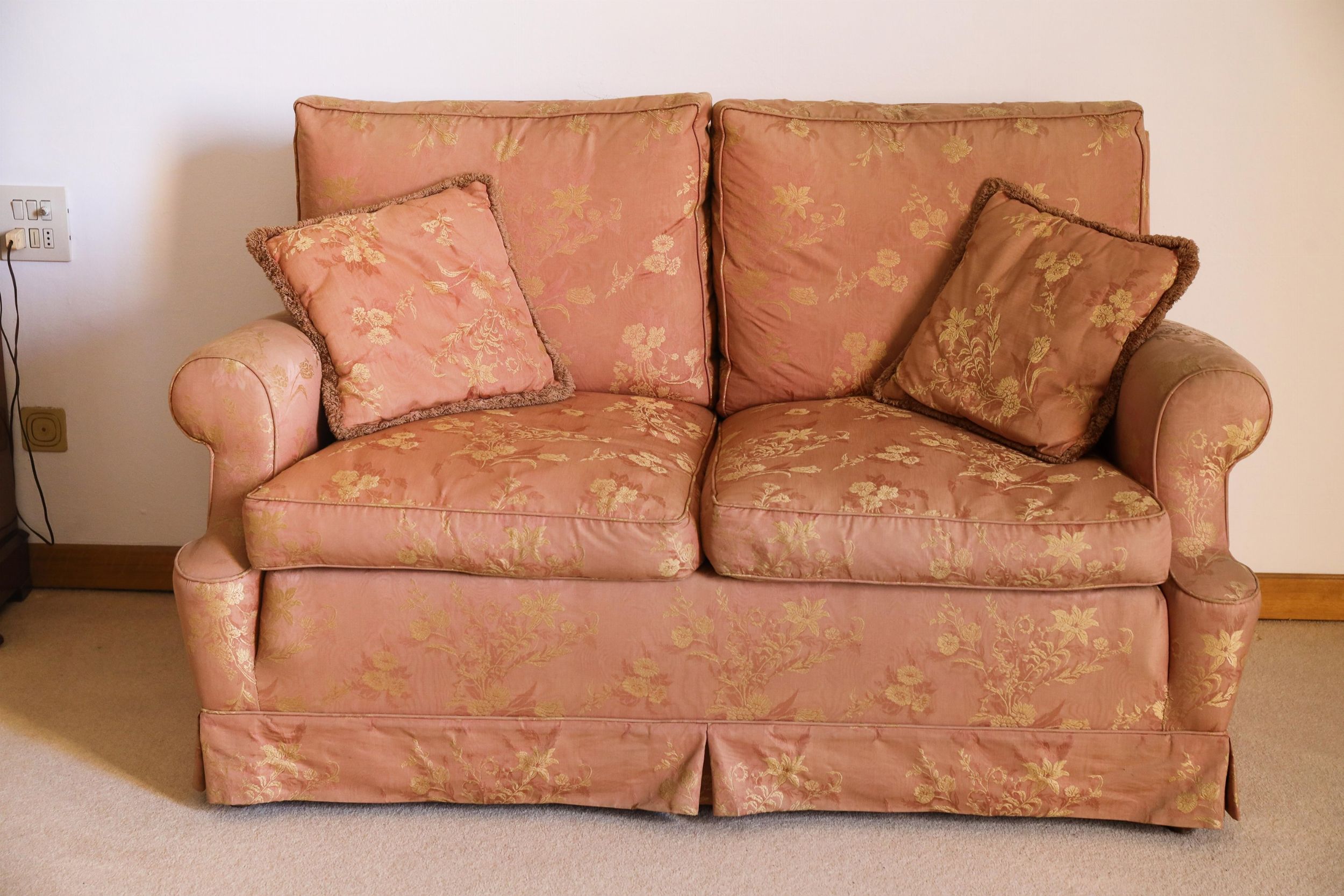 Divanetto a due posti imbottito e rivestito in broccato rosa antico