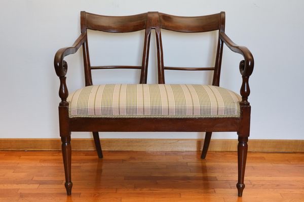 prima metà del XIX secolo schienale bipartito, braccioli a giorno a grande voluta, gambe anteriori a spillo, le posteriori a sciabola, sedile rivestito in seta quadrettata nei toni del beige