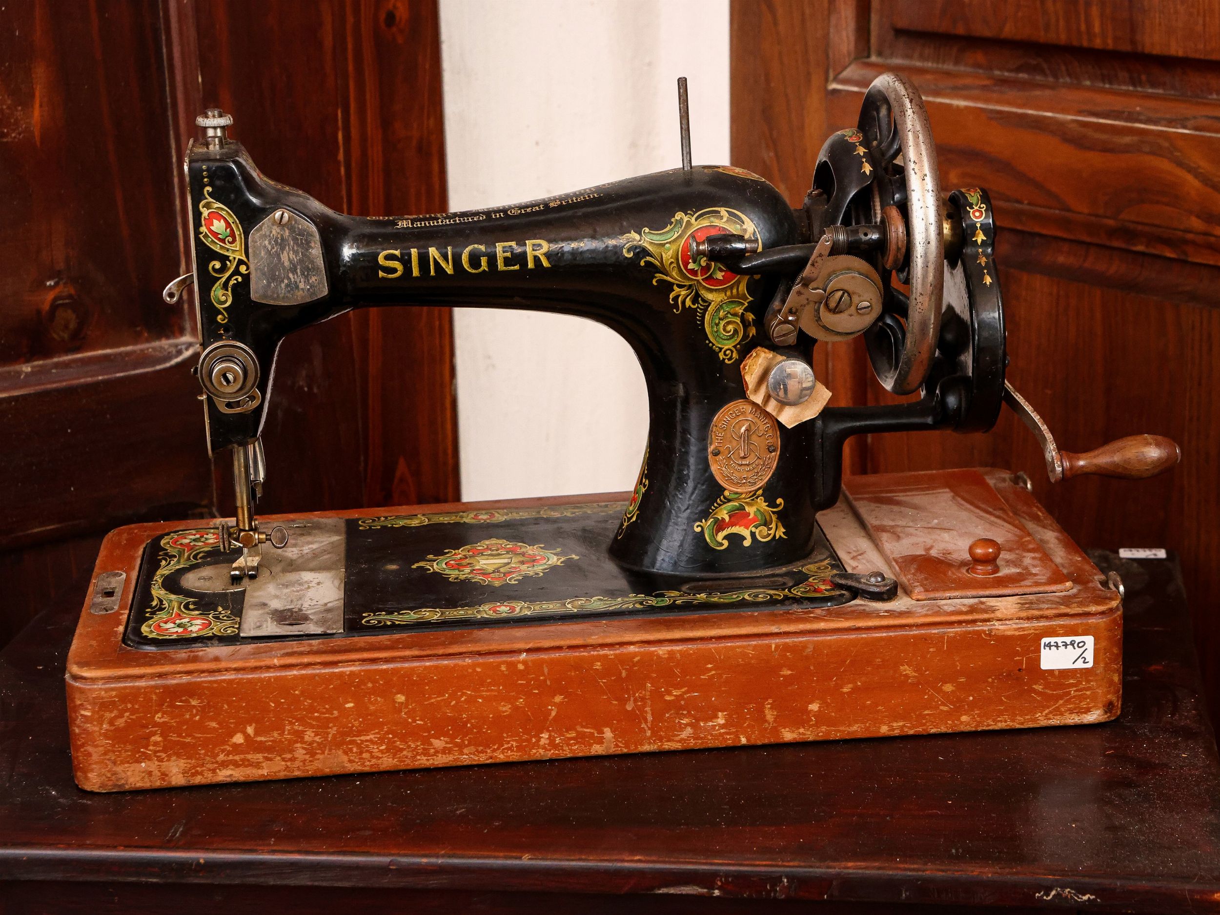 inizio del XX secolo una macchina da cucire Singer ed un tavolino da appoggio rustico in legno tenero