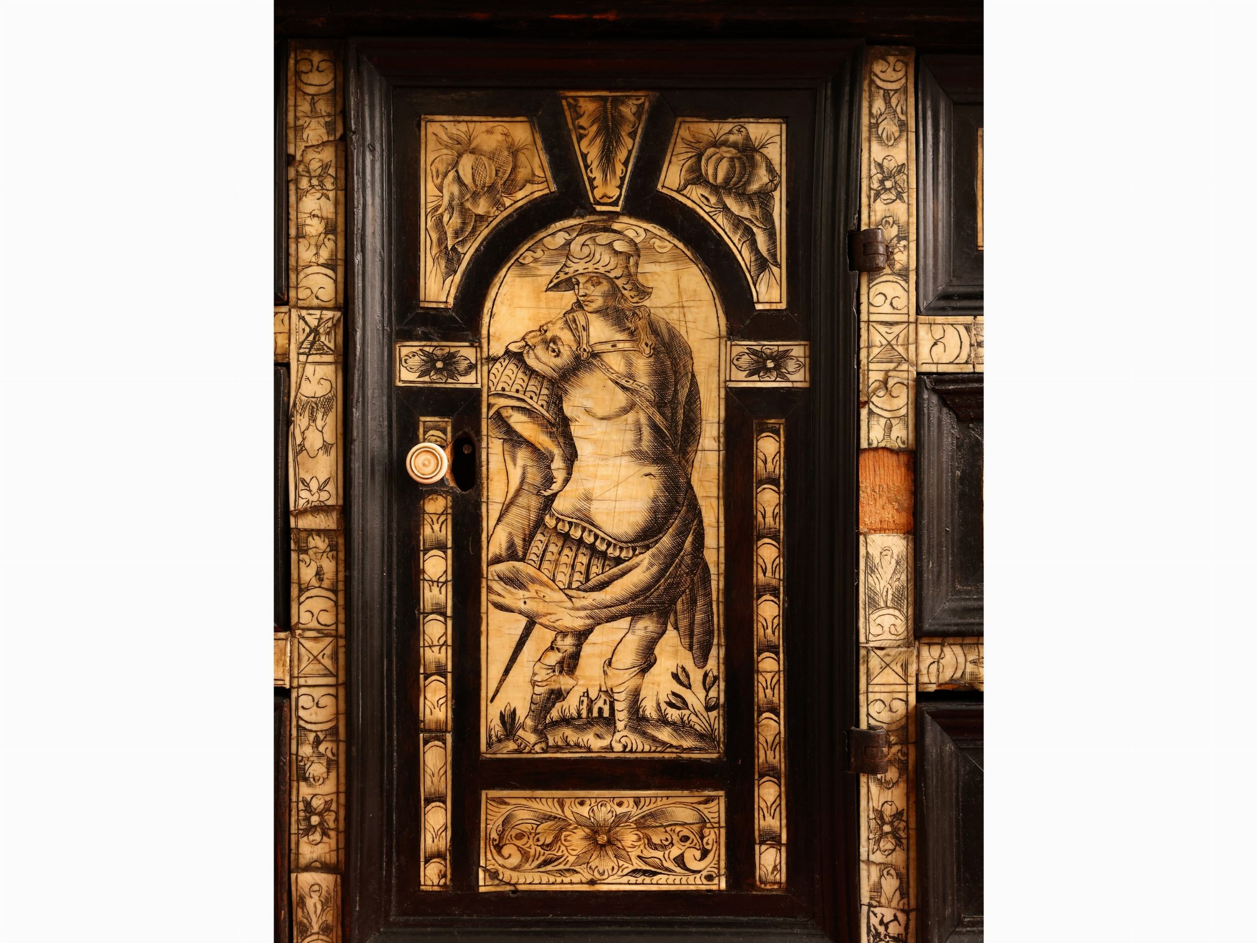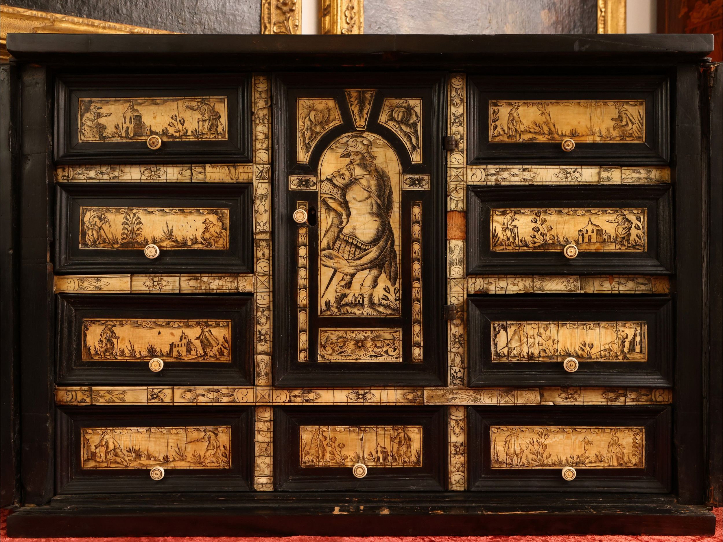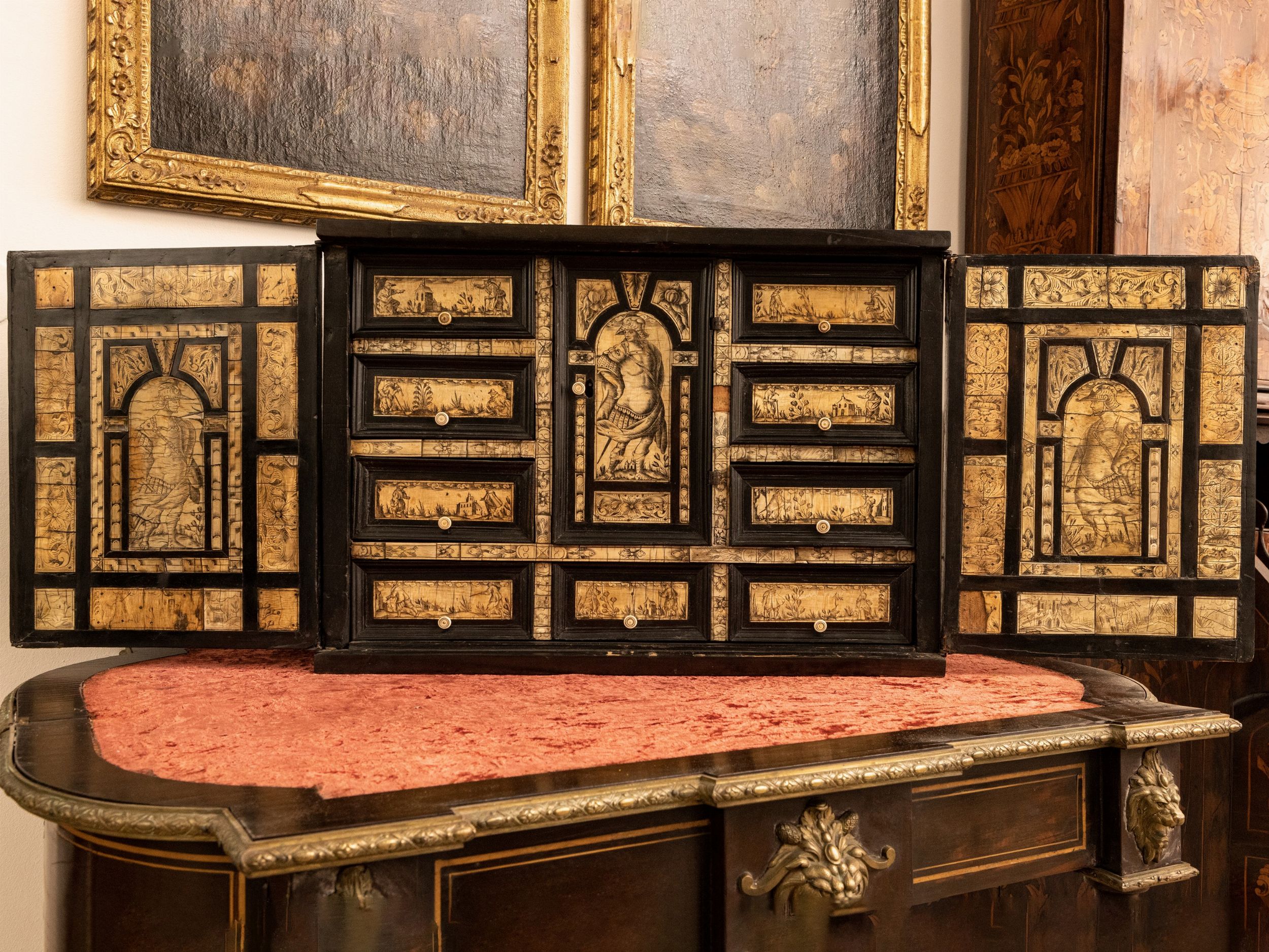 Fiandre, XVII/XVIII secolo interamente impreziosito da tarsie in avorio decorate con scene ispirate alle incisioni di Jacques Callot; se chiuso sulle due ante ed ai fianchi sono presenti filettature a cornice incisa con motivi geometrici, due prese in ferro battuto laterali, all'interno gli sportelli sono centrati da due formelle centinate incise con figure di soldati romani tra cornici a raffaellesche, al centro sportello inciso con figura simile tra trionfi di frutti, incorniciato da nove cassettini decorati con scene alla Callot con personaggi entro paesaggi, segreto, alcun difetti, alcune mancanze, sono presenti frammenti