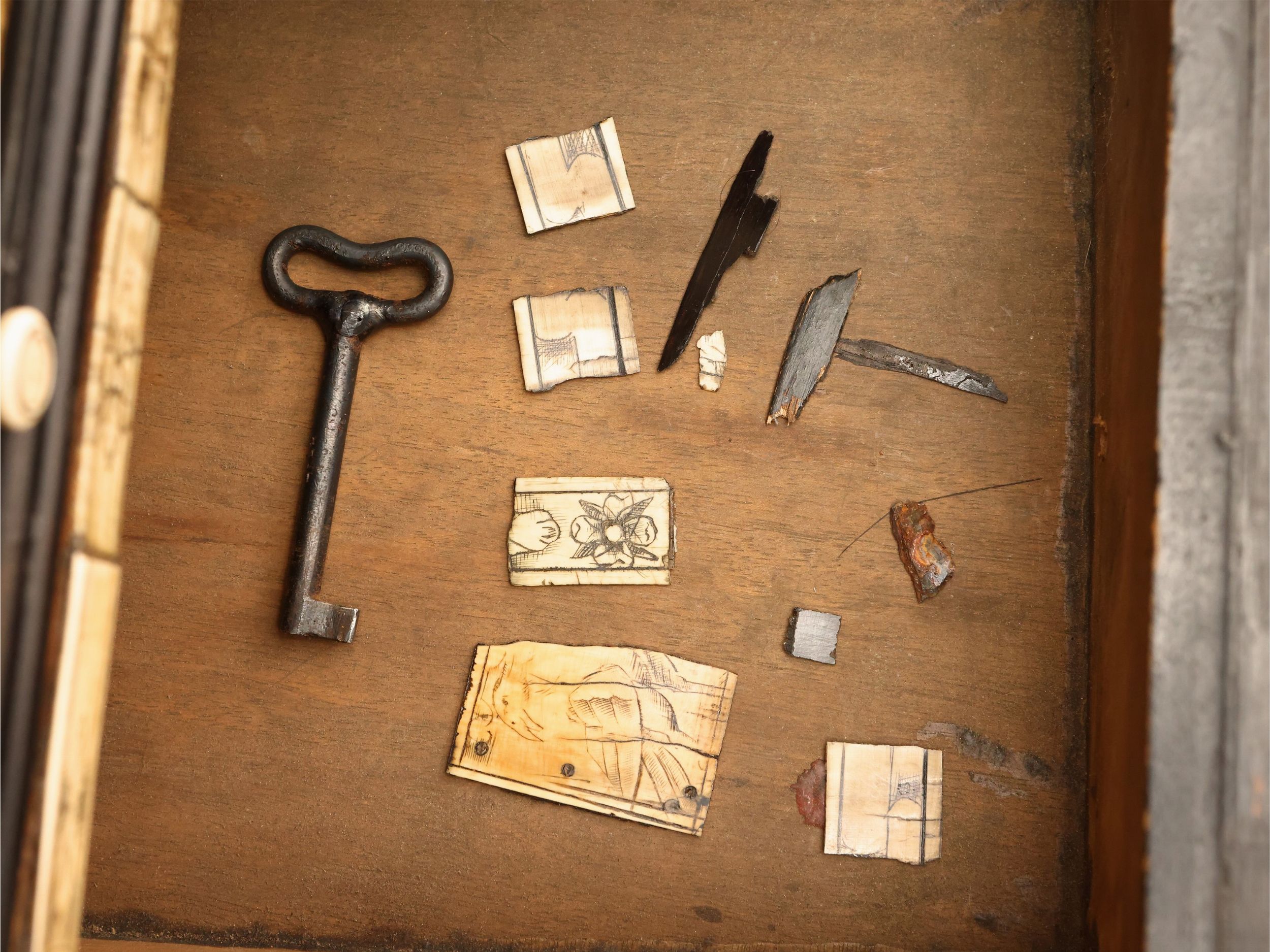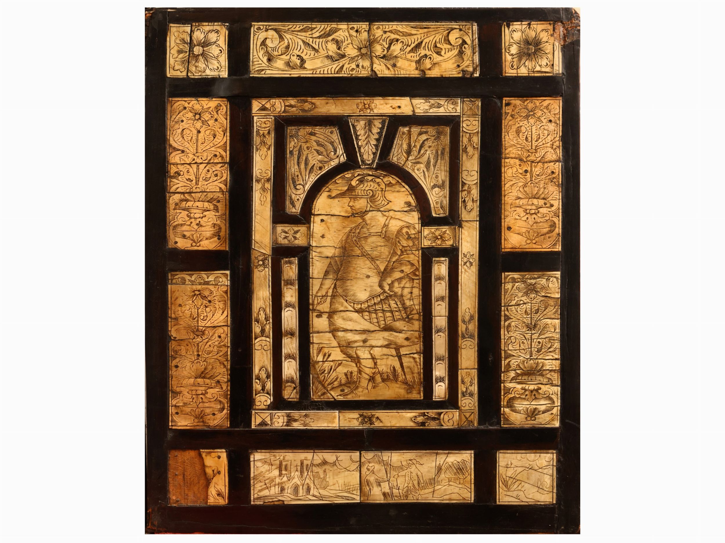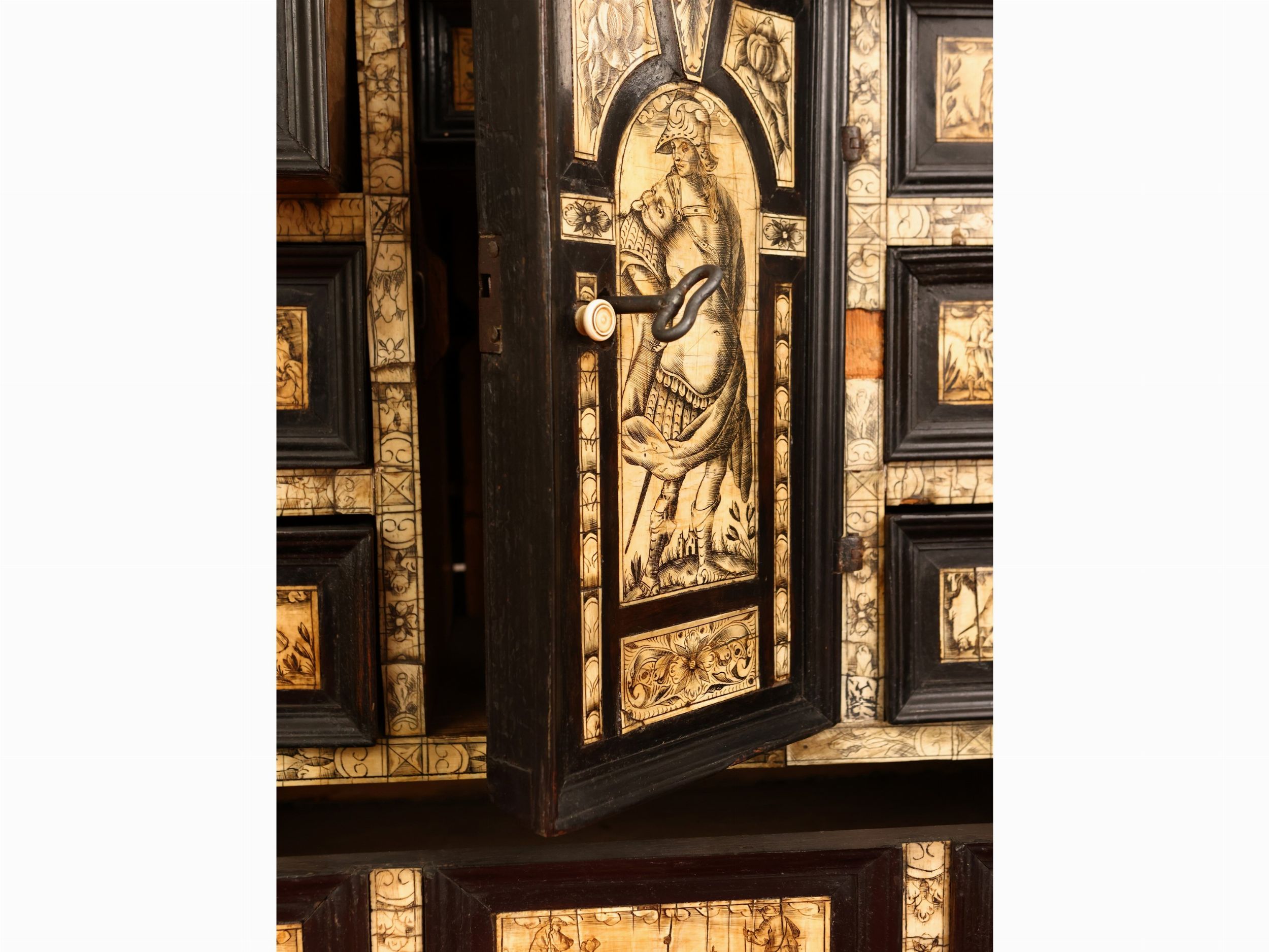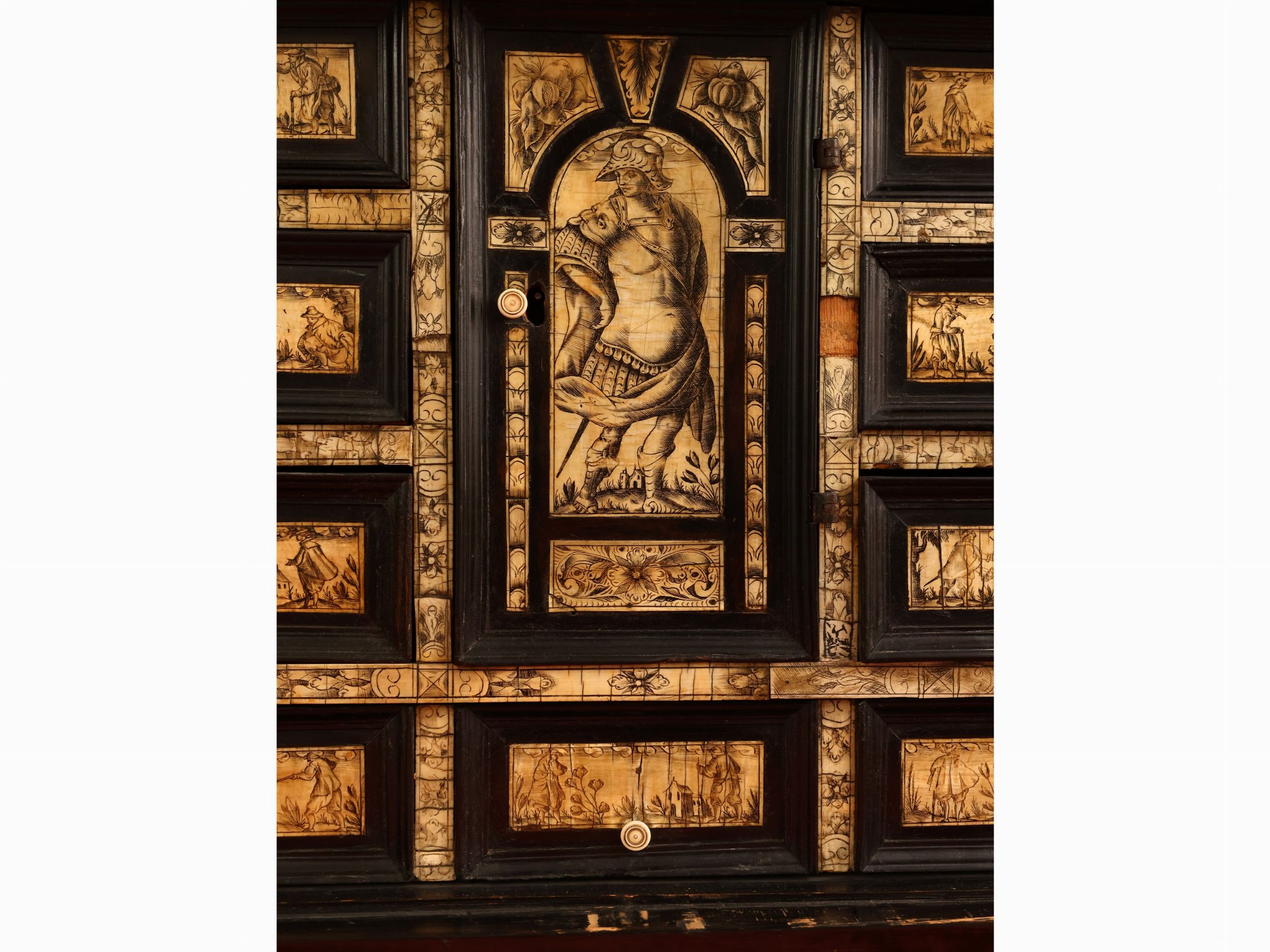 Fiandre, XVII/XVIII secolo interamente impreziosito da tarsie in avorio decorate con scene ispirate alle incisioni di Jacques Callot; se chiuso sulle due ante ed ai fianchi sono presenti filettature a cornice incisa con motivi geometrici, due prese in ferro battuto laterali, all'interno gli sportelli sono centrati da due formelle centinate incise con figure di soldati romani tra cornici a raffaellesche, al centro sportello inciso con figura simile tra trionfi di frutti, incorniciato da nove cassettini decorati con scene alla Callot con personaggi entro paesaggi, segreto, alcun difetti, alcune mancanze, sono presenti frammenti
