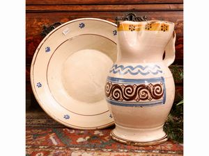 h cm 30, diam cm 35 XIX secolo la brocca dipinta con motivi geometrici nei toni del bruno e dell'azzurro, il [..]