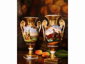 h cm 25 metà del XIX secolo dipinti a tutto tondo con paesaggi agresti e personaggi popolari, lumeggiati in oro, [..]