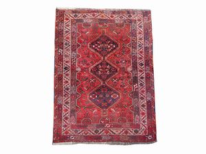 cm 160x115 impianto geometrico su campo nei toni del rosso, medaglione contrale a losanga uncinata