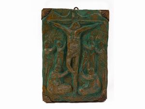 cm 24x33 Anni Cinquanta formella in terracotta patinata ad imitazione del bronzo, ancorata a tavola in legno, [..]
