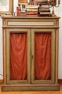 h cm 123x97x38 XIX secolo due sportelli a rete con tendine in seta rosa antico sul fronte dritto, base a cornice, [..]