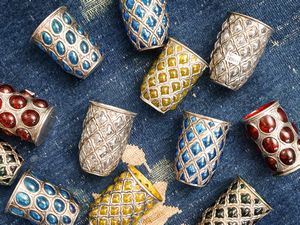 Serie di dodici bicchieri tubler in vetro colorato e metallo inciso