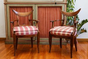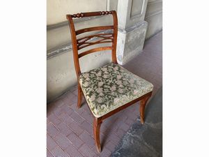 h cm 95 (3) inizio del XX secolo spalliere a cartelle orizzontali sagomate, sedute impagliate a cordonetto, d [..]