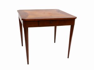 h cm 77x88x88 fine del XVIII secolo piano intarsiato con filettature, gambe a faretra