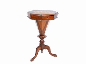 h cm 74x43x43 seconda metà del XIX secolo piano ottagonale intarsiato in varie essenze con scacchiera, vano sottostante, [..]