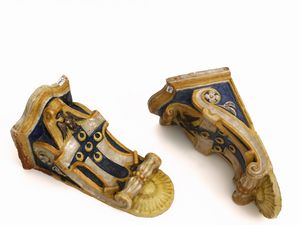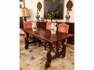 h cm 81x176x80 XVII secolo sostegni sagomati a lira riuniti da traverse tornite incrociate in ferro battuto, [..]