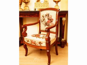 h cm 102 inizio del XX secolo spalliera sagomata centrata da cartiglio, traverse a cancello, gambe dritte riunite [..]