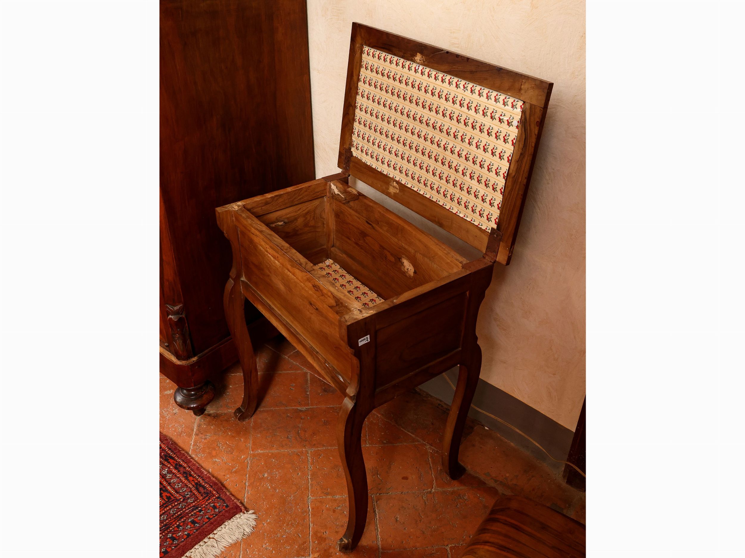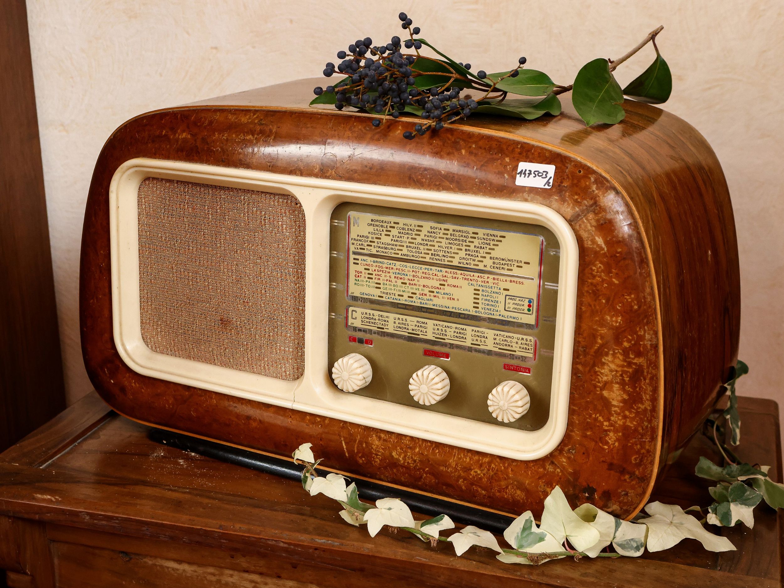 prima metà del XX secolo composto da una radio a valvole e da un tavolino in noce, piano da aprirsi a celare un vano, gambe leggermente mosse