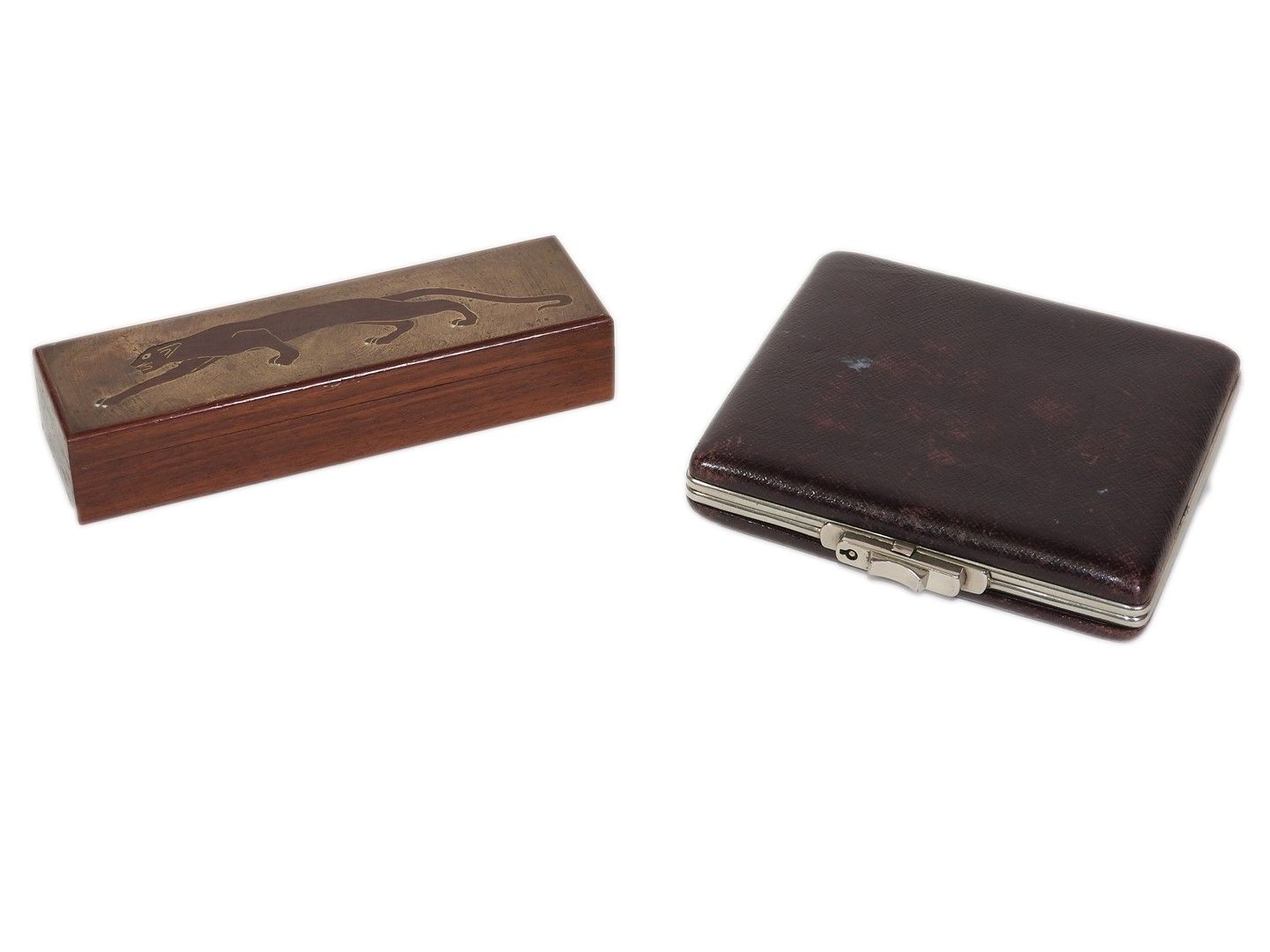 scatola portapenne in legno di rosa, di forma rettangolare allungata, coperchio rivestito in matello con intarsio ligneo raffigurante una pantera e borsello portadocumenti in pelle, realizzato a soffietto
