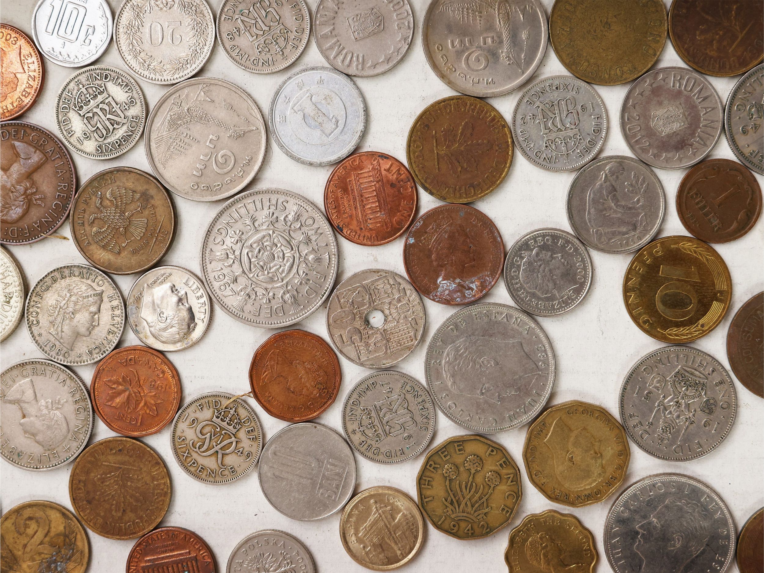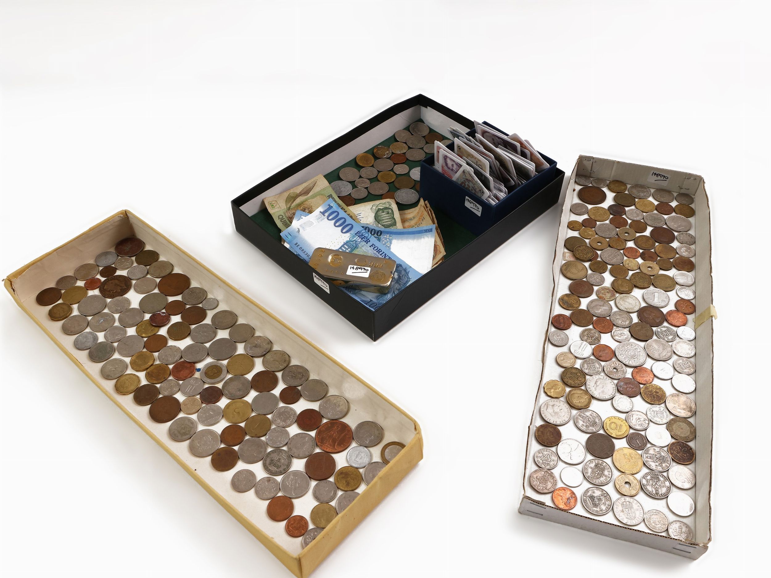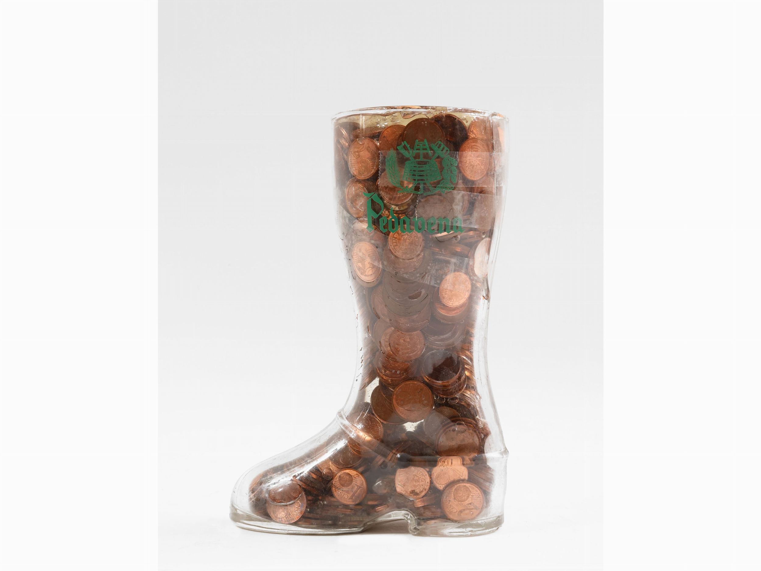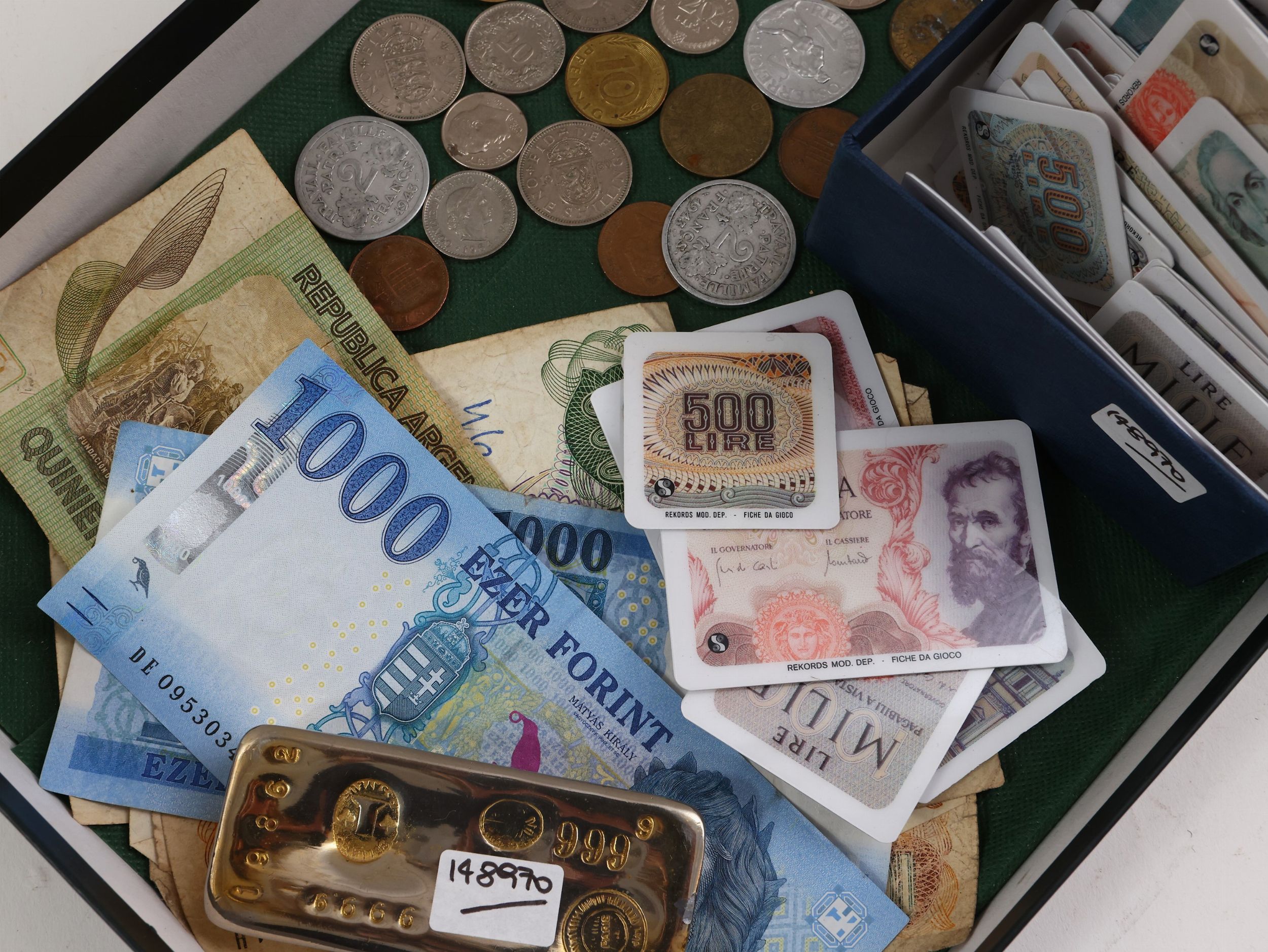 composto da monete, banconote e fiches a imitazione delle lire, alcune monete fuori corso, corredato da un piccolo stivale salvadanaio in vetro ed un ferma banconote in metallo argentato, difetti