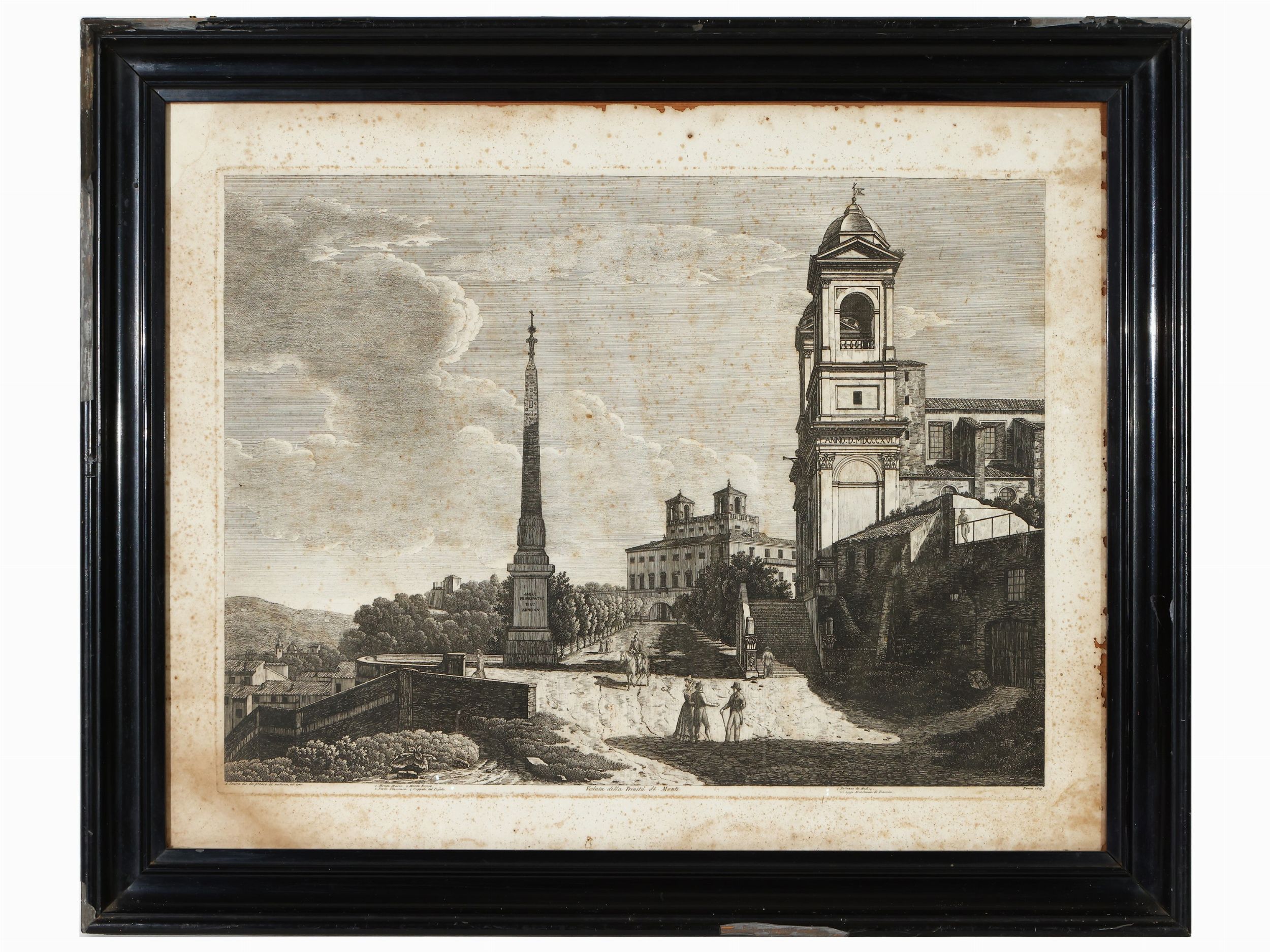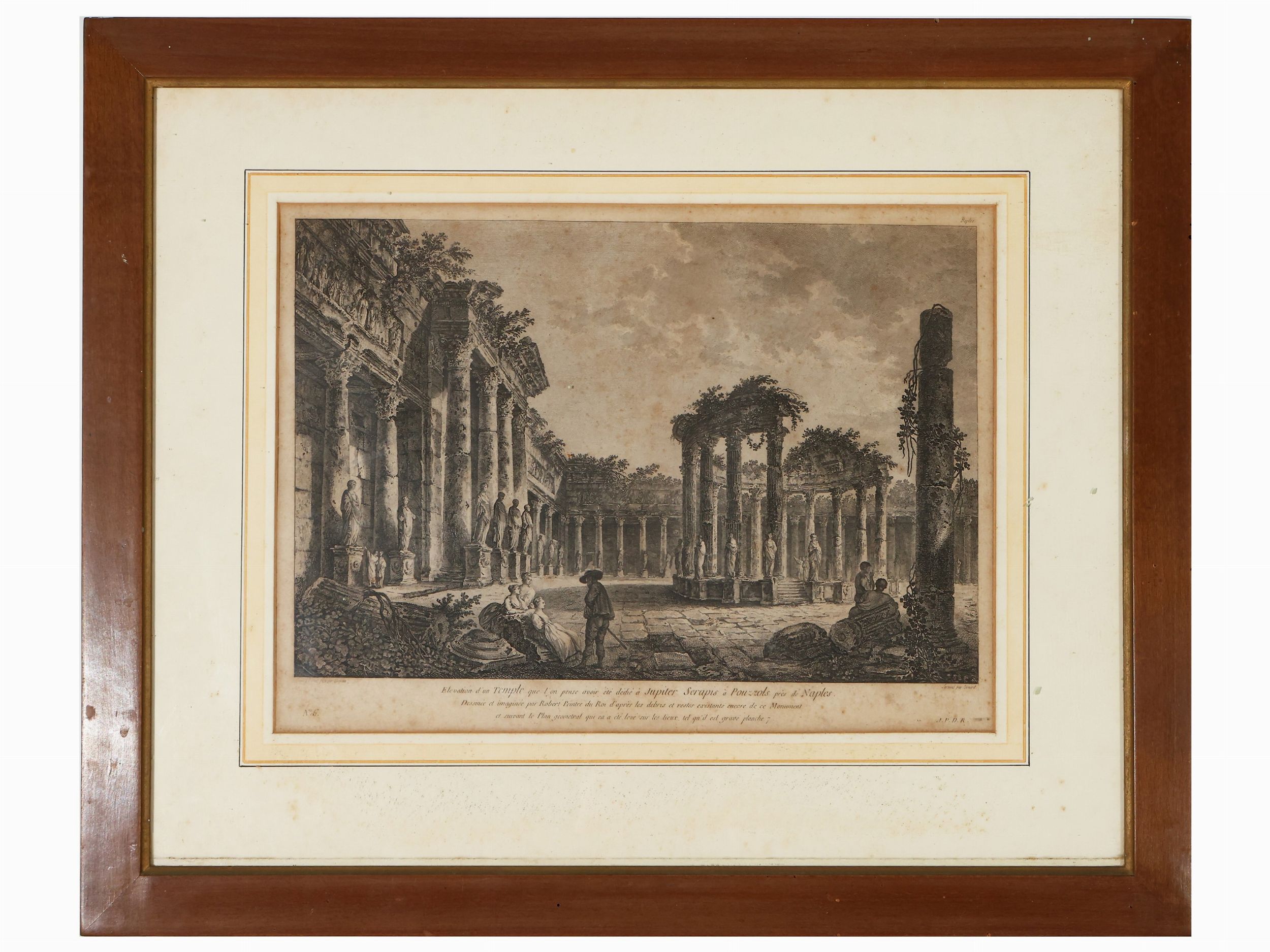 XVIII/XIX secolo Tempio di Giove a Pozuollo, incisione, in cornice, alcuni difetti, da: Voyage pittoresque ou description des royaumes de Naples et de Sicile, 1727-1791; Agostino Penna (XIX secolo) Veduta degli avanzi del Teatro di Marcello, in oggi Palazzo Orsini - Veduta della Trinità dè Monti, due incisioni, in cornice, alcuni difetti