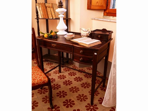 inizio del XX secolo piano leggermente sagomato in parte rivestito in in stoffa spalmata, alzata ad un cassetto, tre cassetti nella fascia, gambe a faretra riunite da traverse