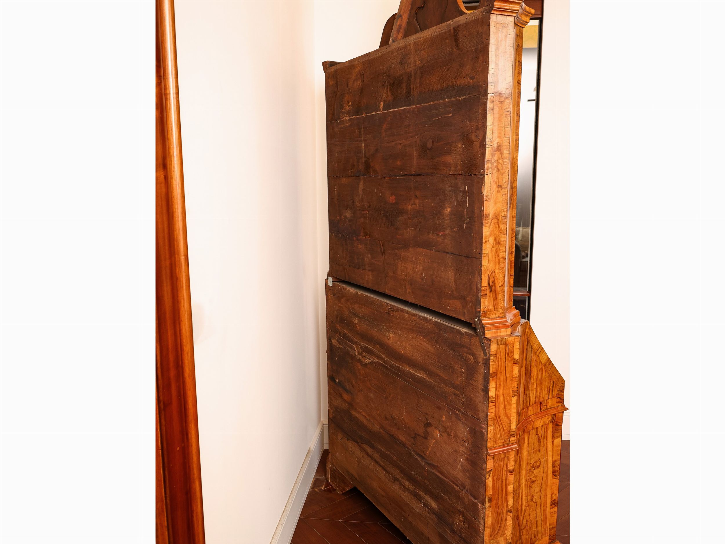 XX secolo realizzato in stile settecentesco, cappello a timpano spezzato, due sportelli con specchi nella parte superiore, sportello a calatoio a celare scarabattolo con tre cassetti sottostanti in quella inferiore
